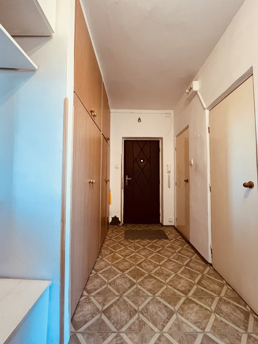 Nabízí se částečně vybavený. Z dlouhé chodby s úložnými prostory vcházíme do koupelny na toaletu, do kuchyně a také do dvou neprůchozích pokojů.