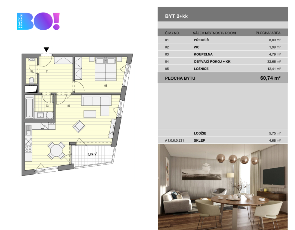 | Dispozice/podlahová plocha: | 2+kk/61 m² |