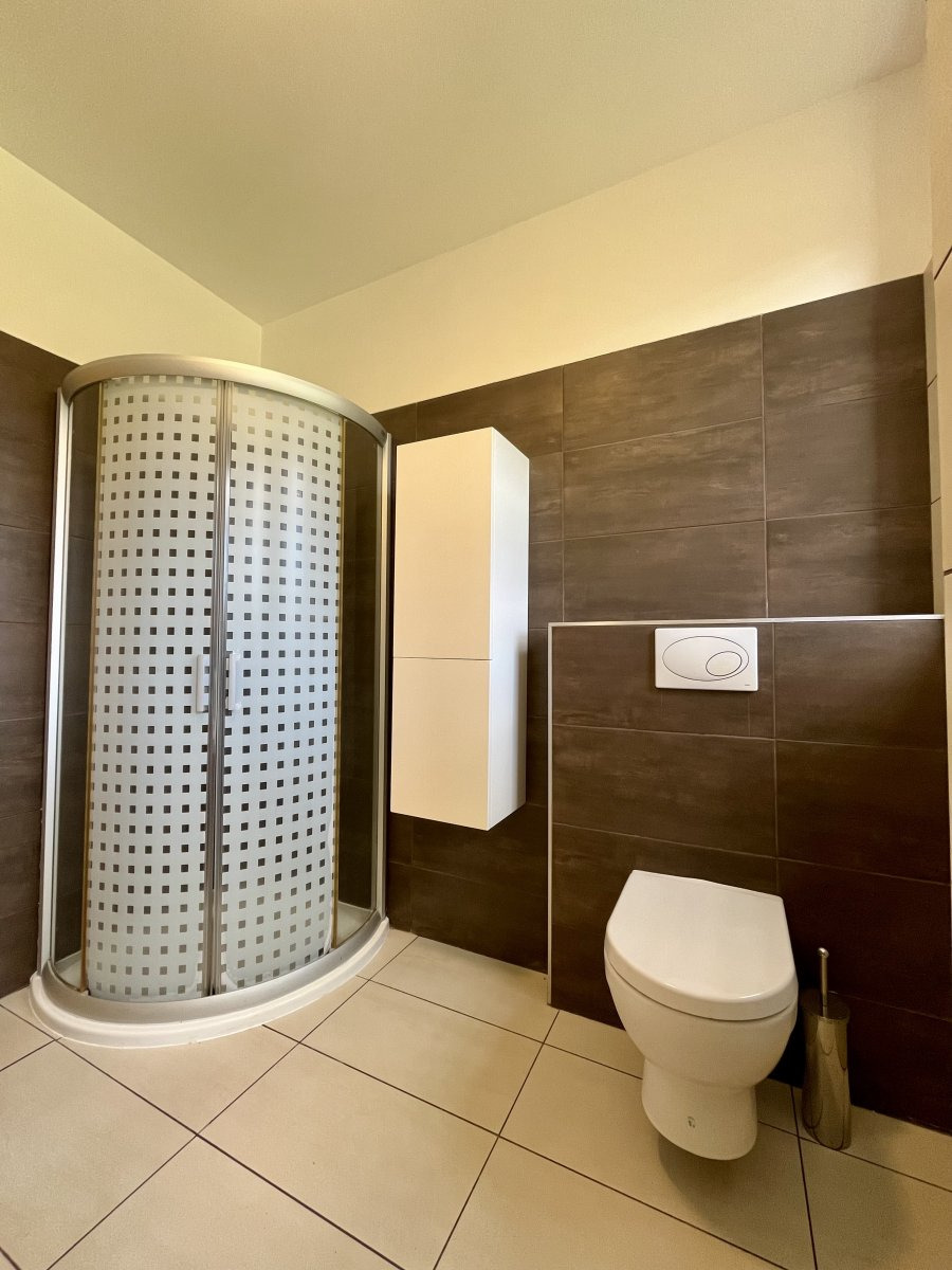 Interiér je částečně vybavený a připravený k okamžitému nastěhování. Moderní kuchyňská linka je osazena vestavěnými spotřebiči – elektrickou troubou, sklokeramickou varnou deskou s digestoří, lednicí, myčkou i mikrovlnnou troubou. Byt disponuje dvěma neprůchozími pokoji, což zajišťuje dostatek soukromí i komfortu. Součástí bytu je také prostorná koupelna se sprchovým koutem, která nabízí dostatek místa pro pohodlné každodenní fungování.
