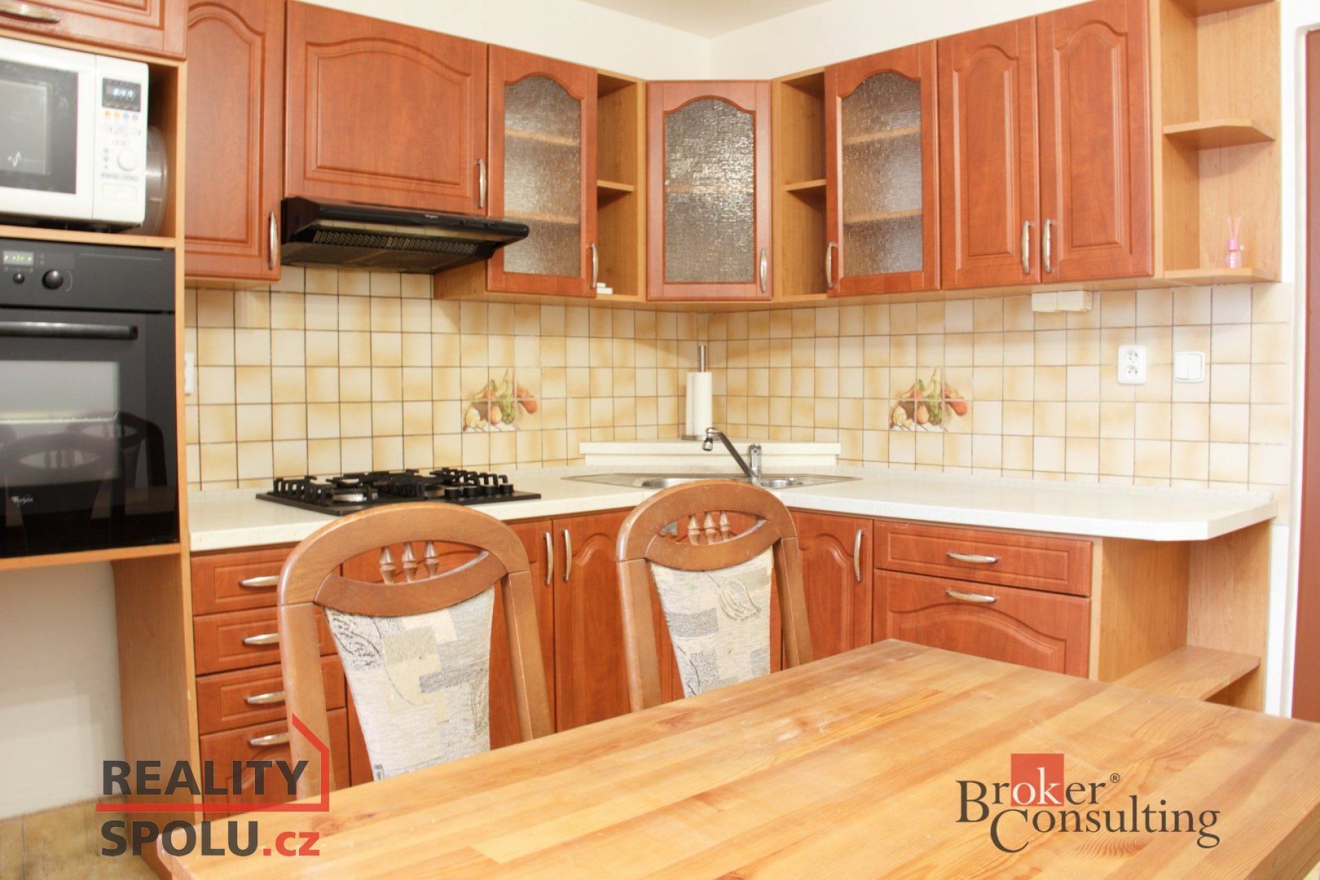 Součástí vybavení je kuchyňská linka s plynovým sporákem, troubou, digestoří, mikrovlnnou troubou a jídelním setem. V obývacím pokoji zůstává obývací stěna.