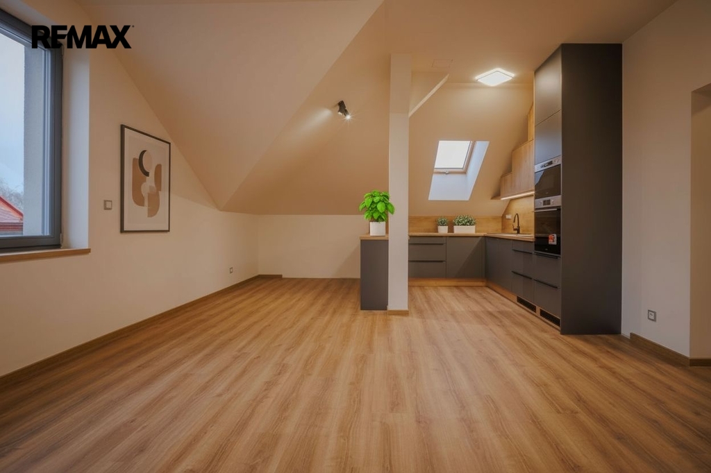 Byt se nachází ve 3. NP bez výtahu. Dispozice 3+kk, v předsíni zabudovány velmi dobře řešené vestavné skříně, koupelna s vanou má příjemných 6 m2, samostatná toaleta, nadstandardní až velkorysá kuchyňská linka s vestavnými spotřebiči, velmi komfortní podlahové vytápění. Vše vybudováno nově, právě vy tedy můžete být prvními obyvateli. Byt se pronajímá nezařízený, nábytek na fotografiích je pouze dekorativní.