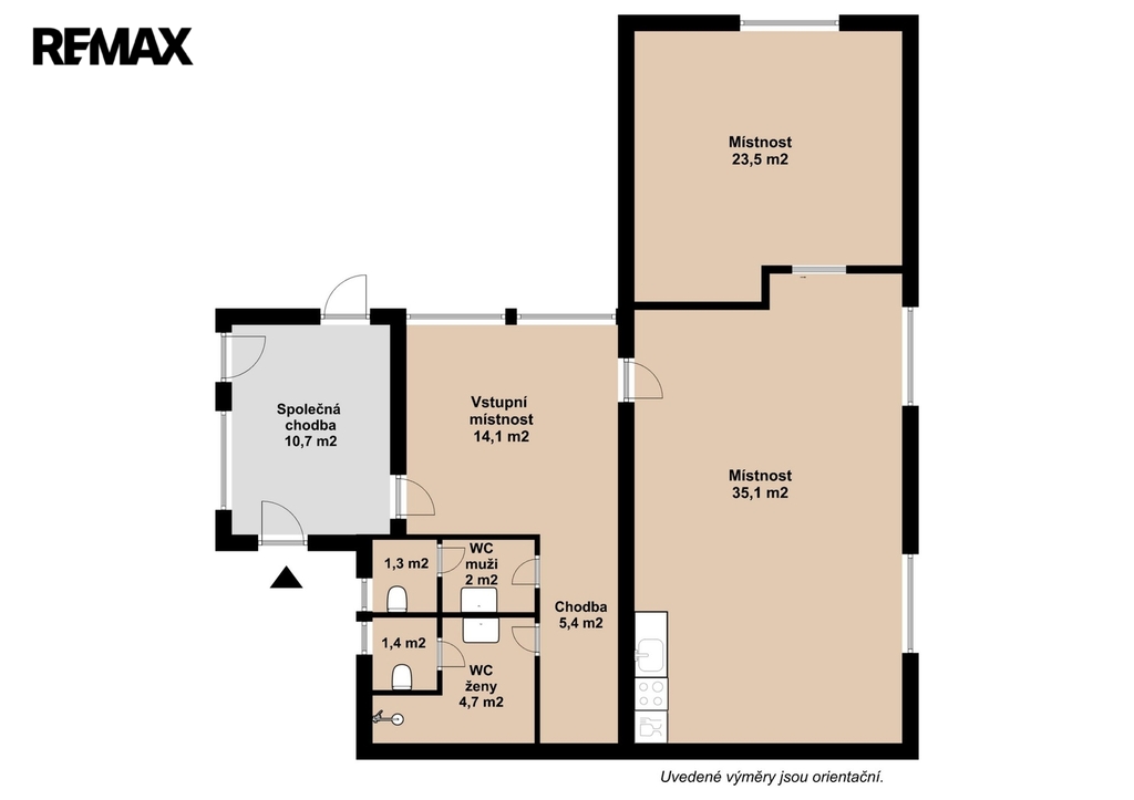 Dispozičně je řešen jako 2 samostatné místnosti s kuchyňským koutem, dále disponuje velkou vstupní chodbou, která může sloužit jako recepce, čekárna či společná zóna (viz půdorys). K dispozici jsou dvě toalety, z nichž jedna je vybavena sprchovým koutem, což zvyšuje komfort pro zaměstnance i klienty.