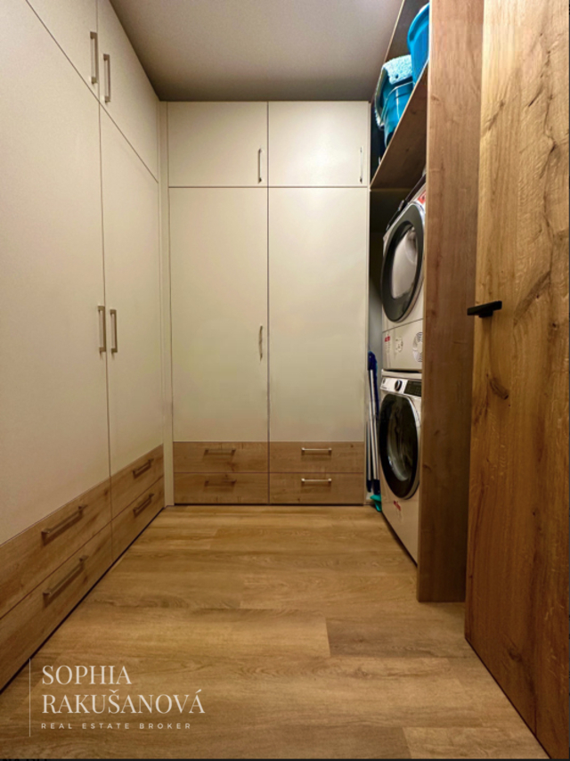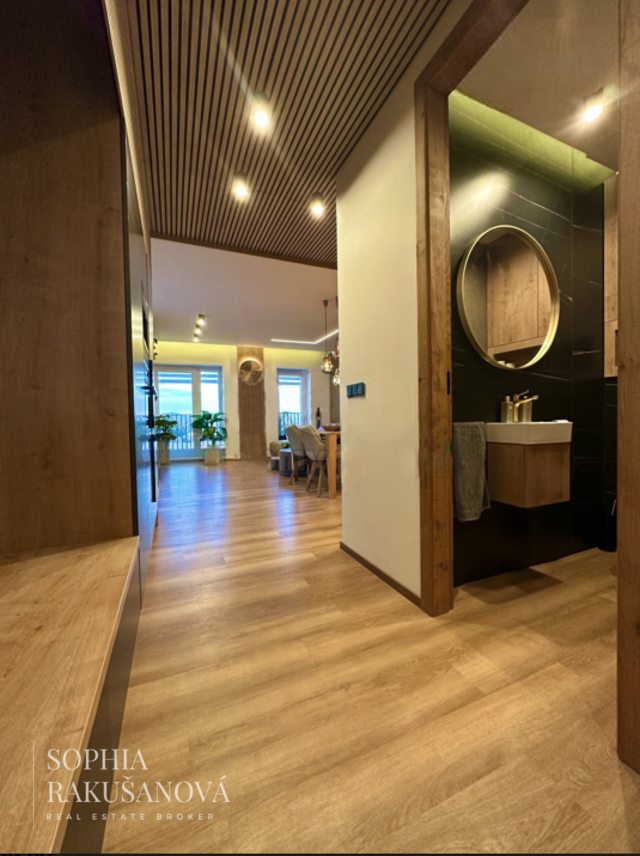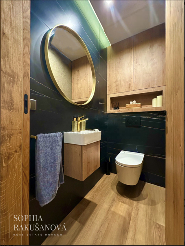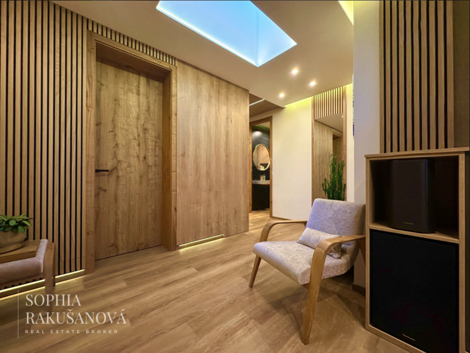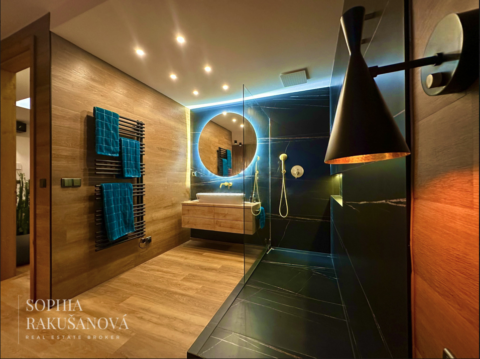 Hlavní ložnice disponuje vlastní designovou koupelnou. Při vstupu do bytu vás zaujme světlík, který přirozeně prosvětluje celý prostor. Komfort bydlení zajišťuje klimatizace, podlahové vytápění a izolační trojskla.