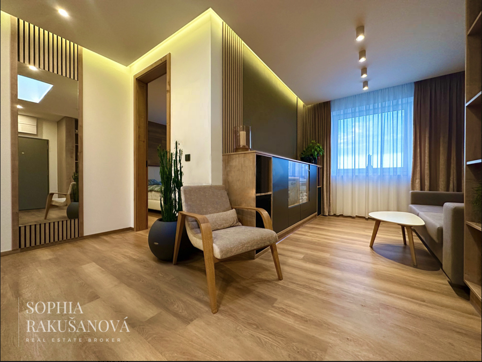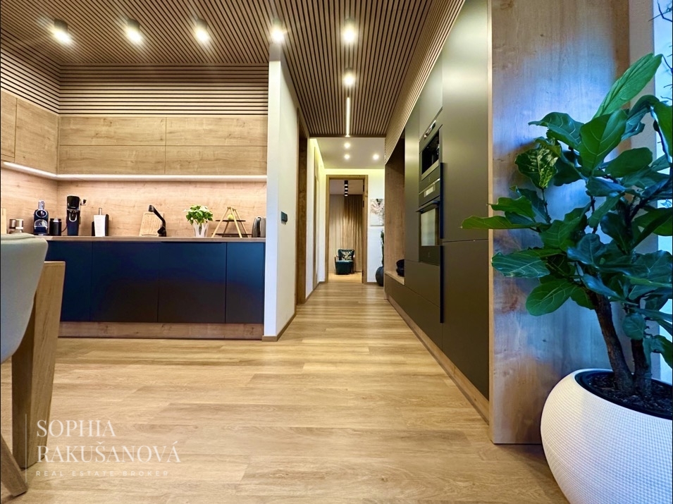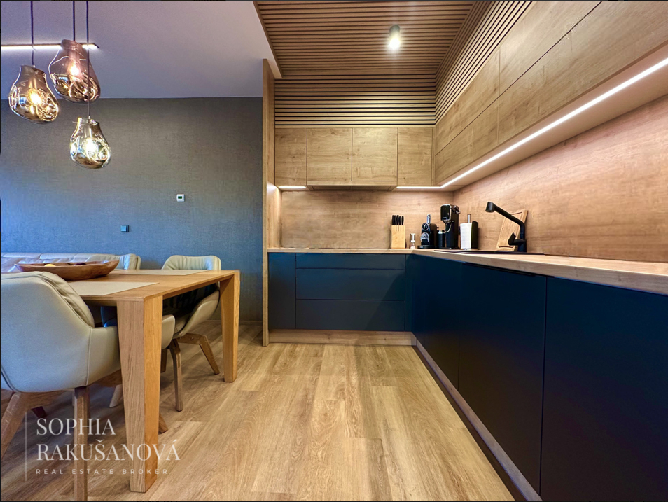 Byt byl navržen s důrazem na kvalitní materiály, moderní technologie a nadčasový design. Dominantou je prostorný a světlý obývací prostor s kuchyní, kompletně vybavenou spotřebiči v elegantním provedení matné černé barvy. Interiér je sladěn do posledního detailu včetně osvětlení a stínění.