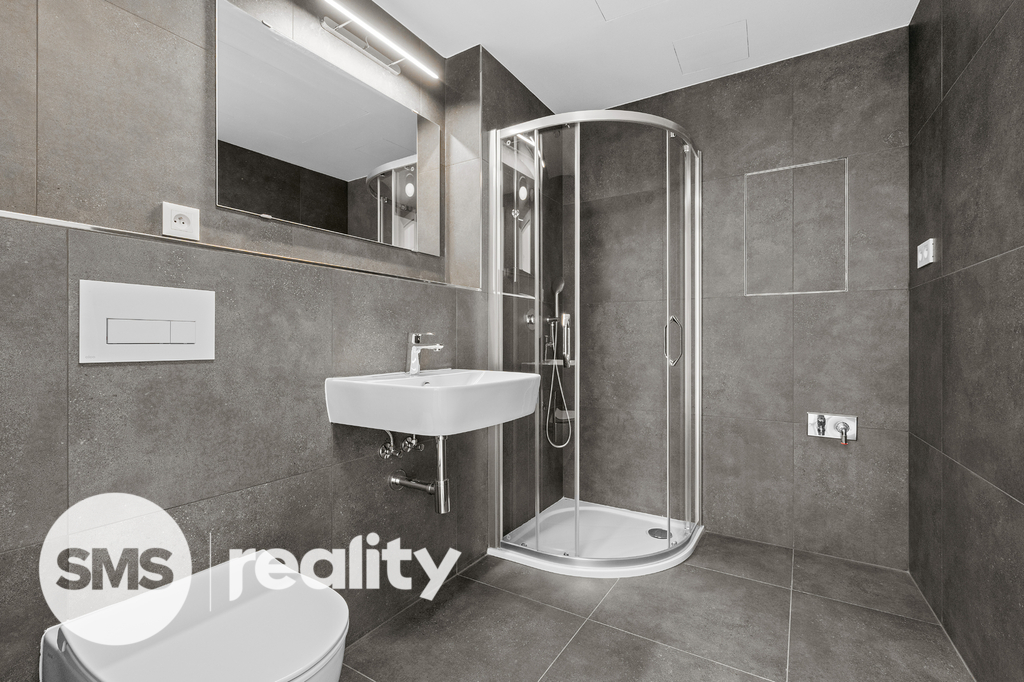 Koupelna je moderní a elegantní, se sprchovým koutem a toaletou.