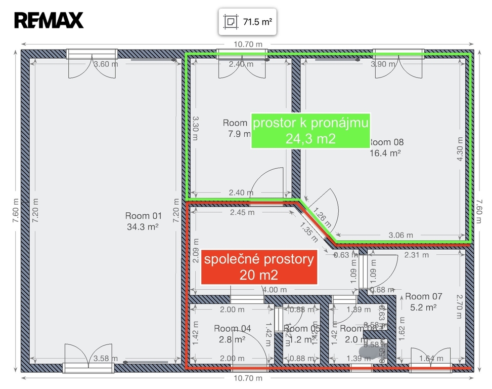 Samotný objekt je jednopodlažní, nepodsklepená budova obdélníkového půdorysu, s valbovou střechou bez využitelného podkroví. Podlahová plocha domu je 72 m2, plocha zahrady včetně parkovacích míst je 835 m2. Novému nájemníkovi bude k dispozici cca polovina objektu o podlahové ploše 35 m2.