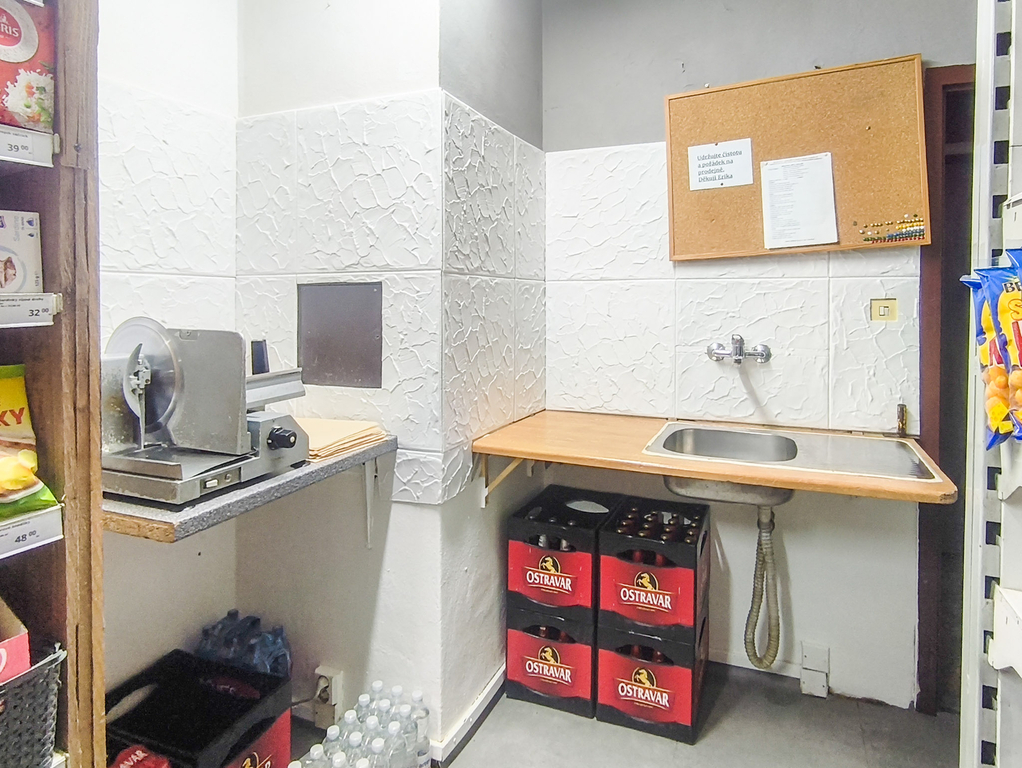 Prostor se skládá z hlavní prodejní části, zázemí s WC a umyvadlem a dvou skladovacích místností, které zajišťují dostatek prostoru pro zásoby i provoz.