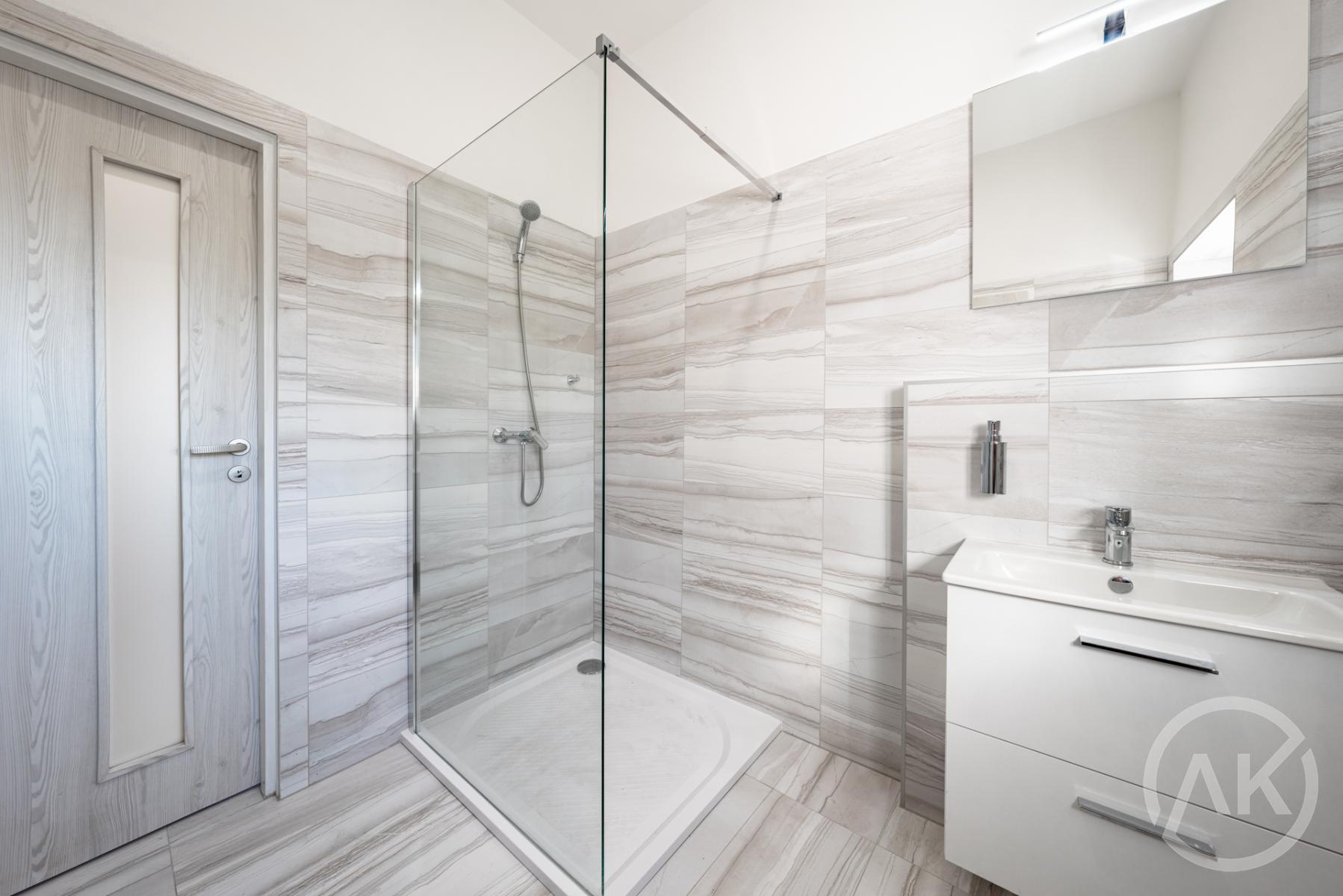 Obytný prostor je tvořen solidním obývací pokojem, moderní, novou kuchyní a koupelnou s velkým sprchovým koutem.