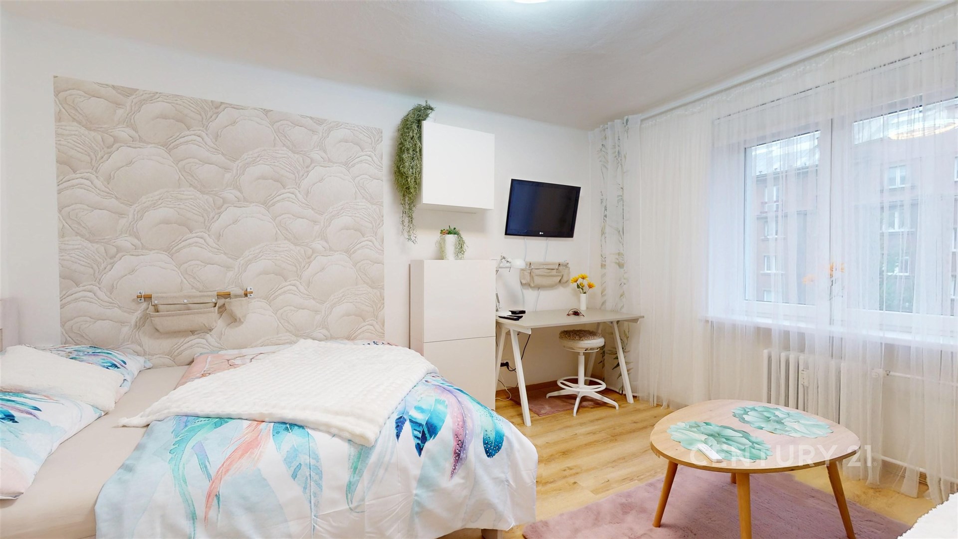 Hlavní obytný pokoj s manželskou postelí, velkou skříní, pohovkou, televizí i pracovním koutem působí útulně.