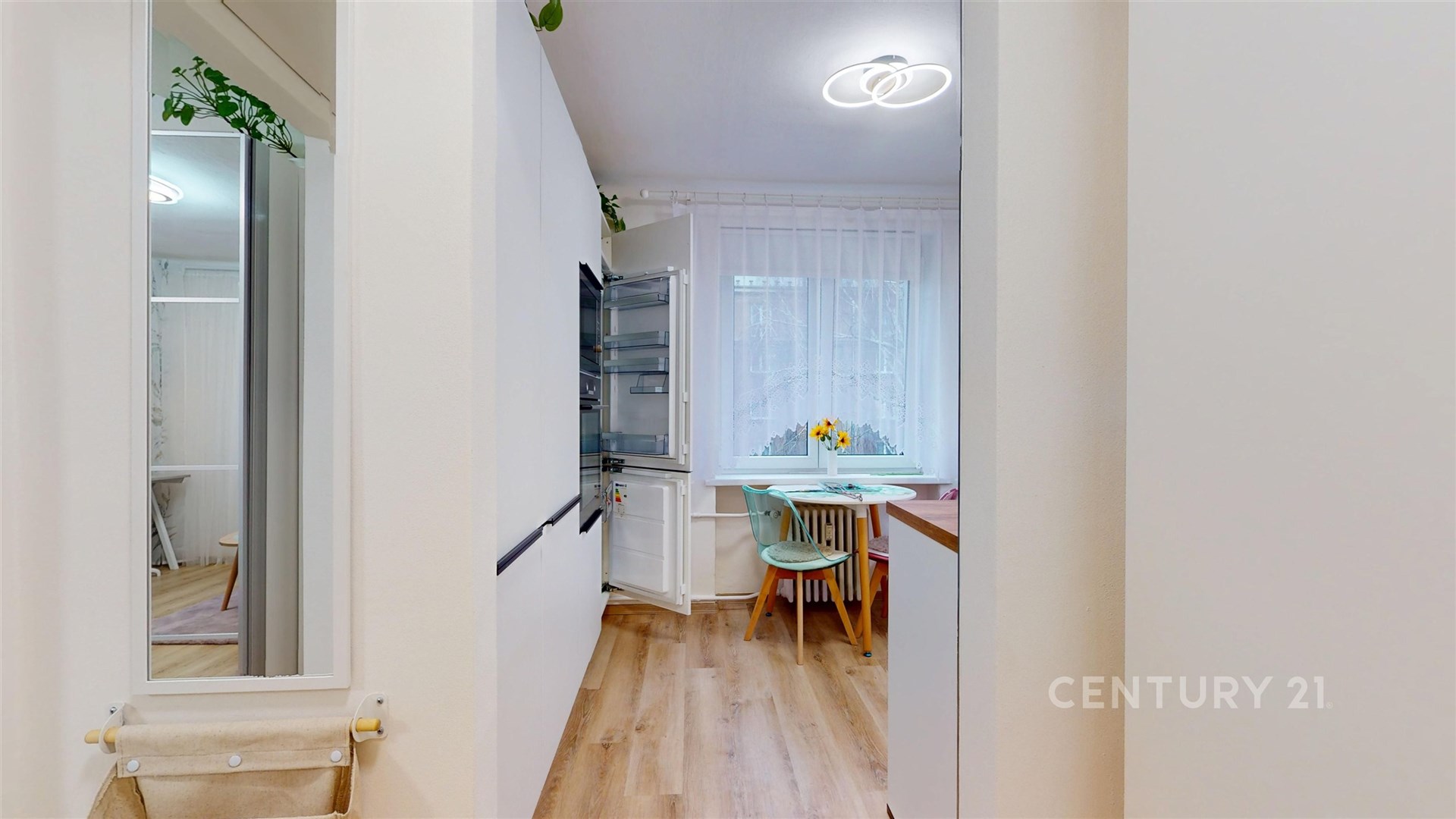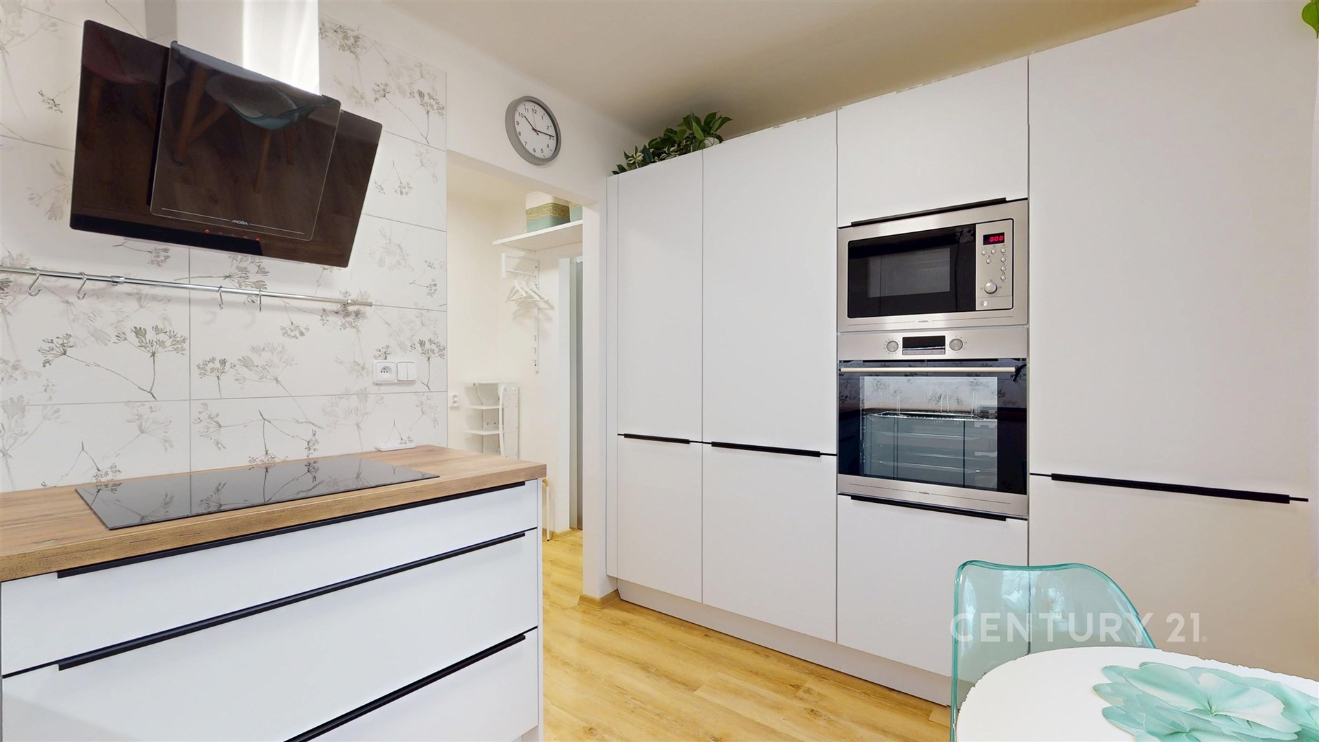 V kuchyni s jídelním stolem a židlemi je moderní kuchyňská linka s velkým množstvím úložného prostoru, se všemi nezbytnými elektrospotřebiči včetně myčky nádobí. Do bytu bude navíc zakoupena pračka na vyhrazené místo v kuchyňské lince.