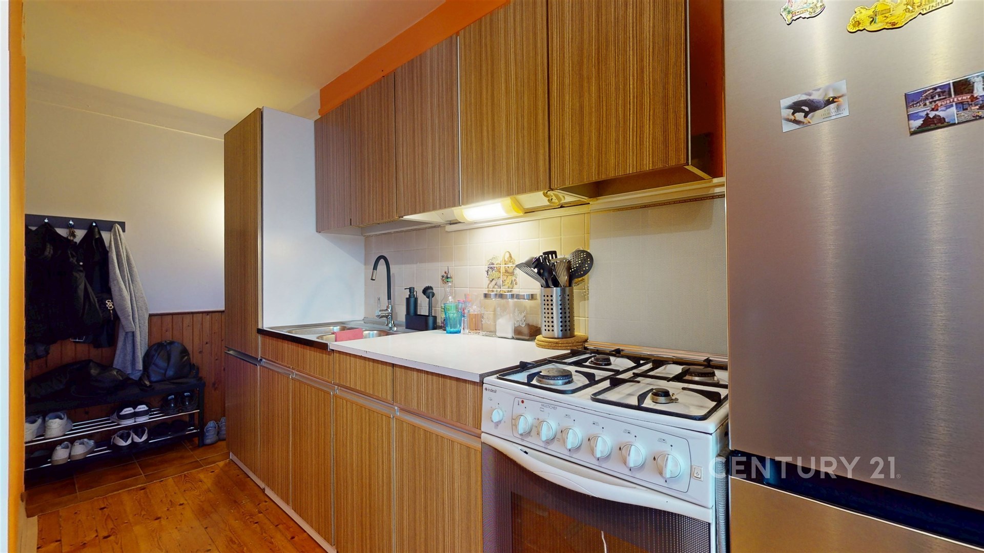 Kuchyně je prakticky situována a vybavena plynovým sporákem a elektrickou troubou, nabízí prostor i pro jídelní stůl.
