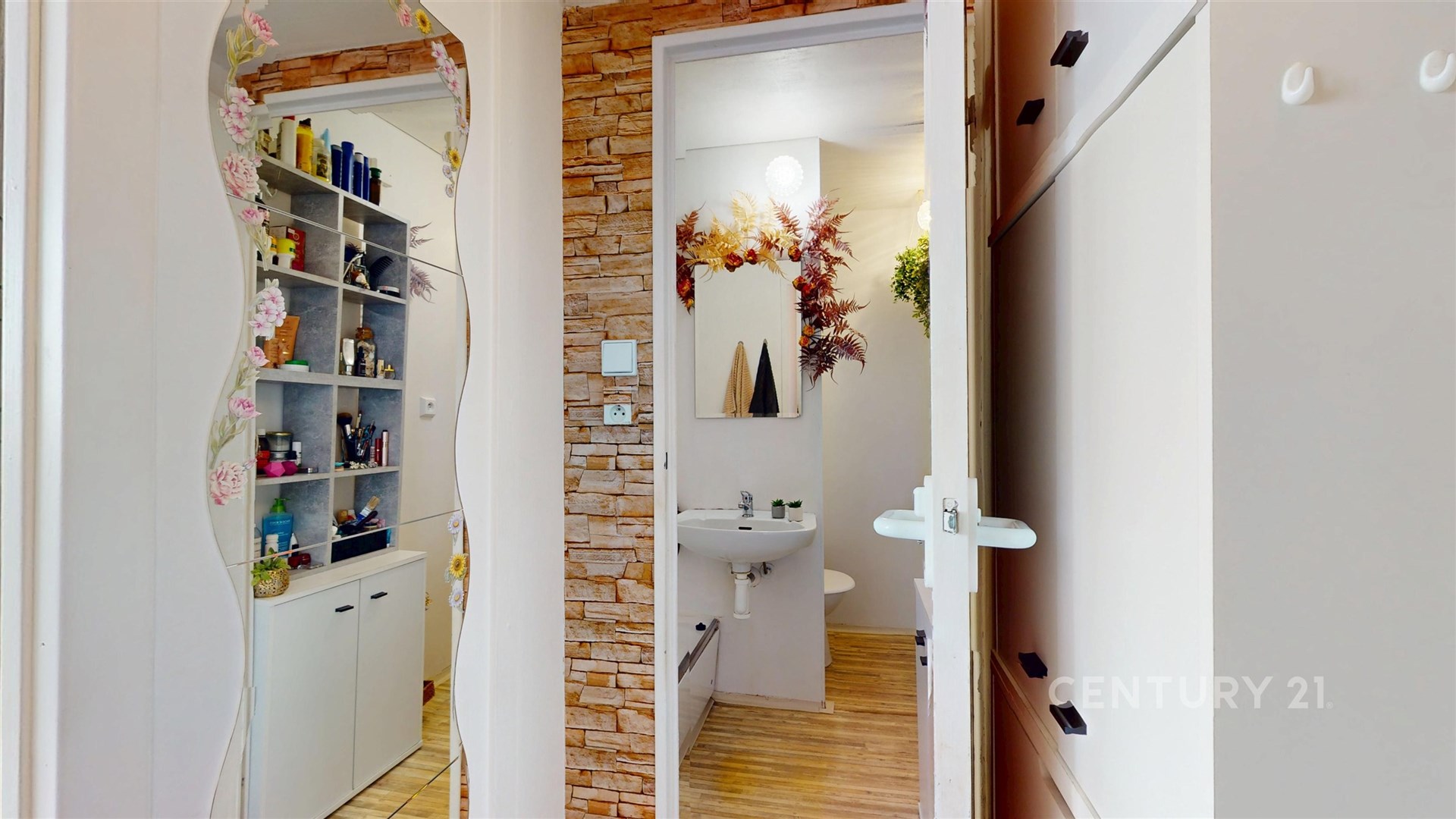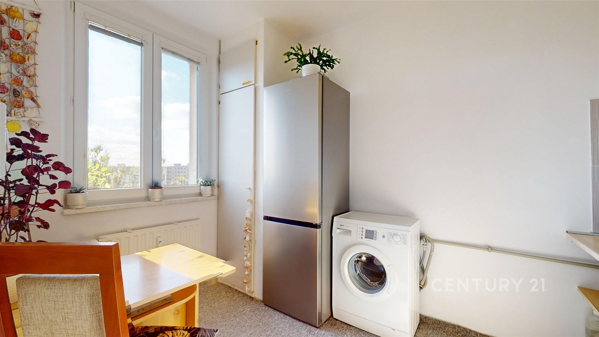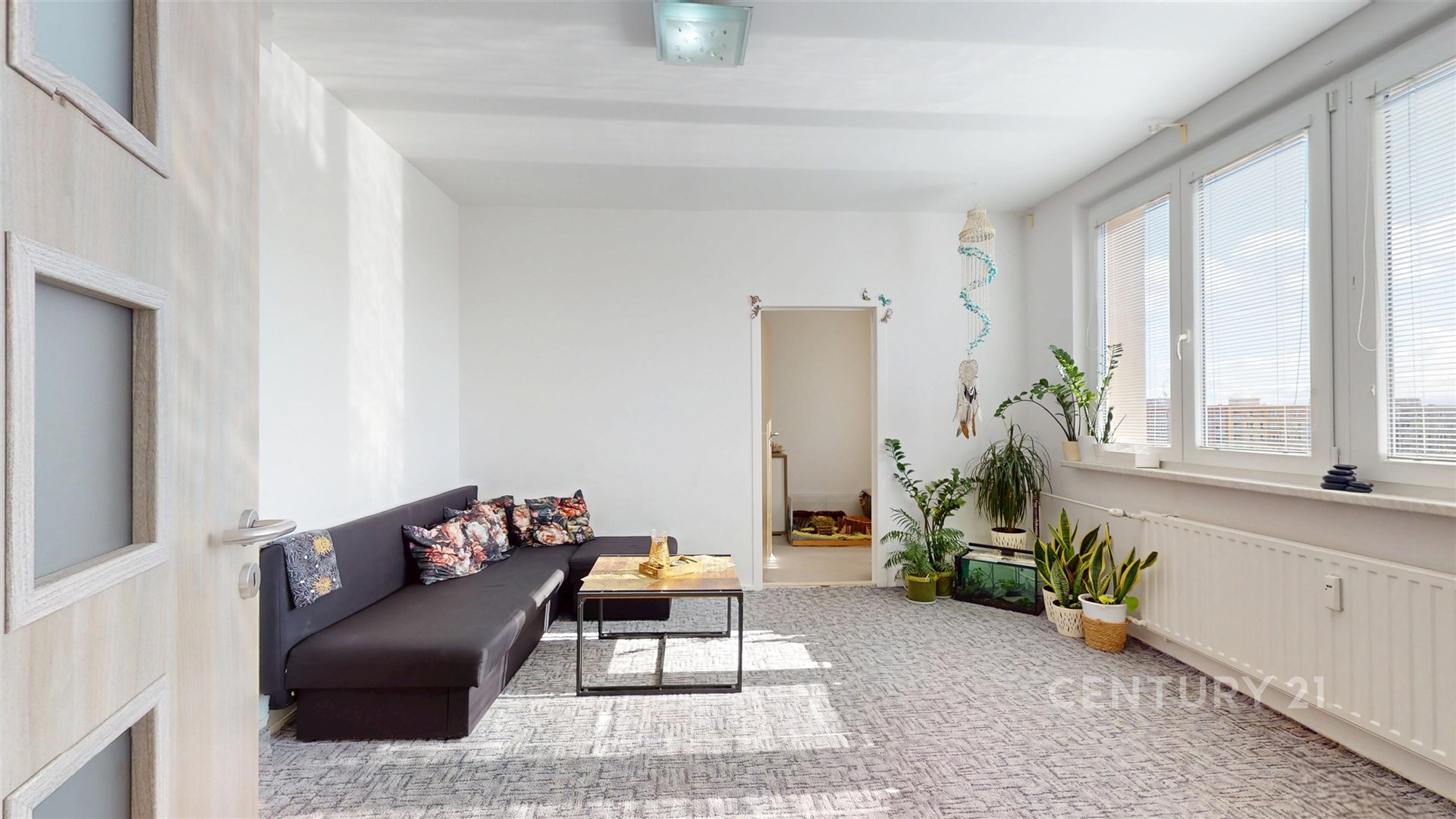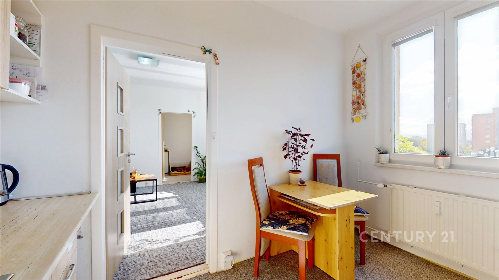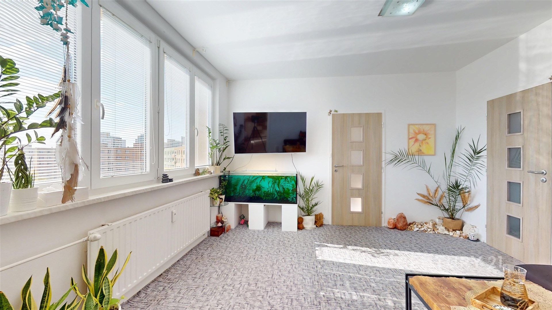 Byt se nachází ve 7. patře a při vstupu Vás přivítá chodba, která nabízí dost místa na vestavěnou skříň, šatník nebo botník. Odtud se dostanete do koupelny a také do hlavní části bytu – světlého obývacího pokoje. Díky několika oknům je prostor krásně prosvětlený a působí vzdušně. Ideální místo na odpočinek, posezení s přáteli nebo klidný večer s knížkou.