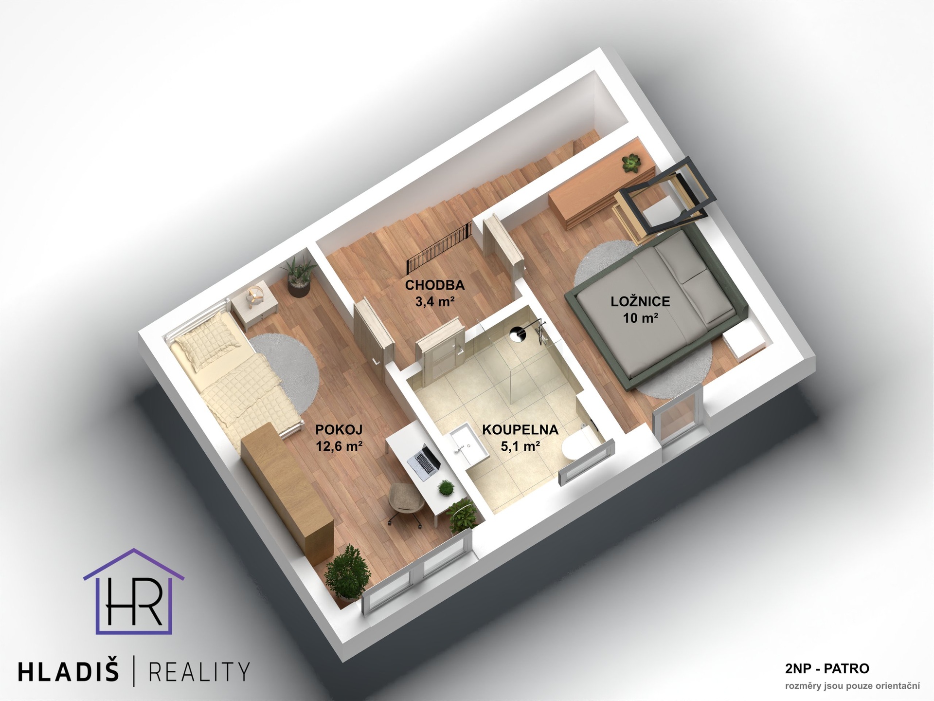 - horní patro nabízí klidovou zónu – ložnici, další pokoj a koupelnu
