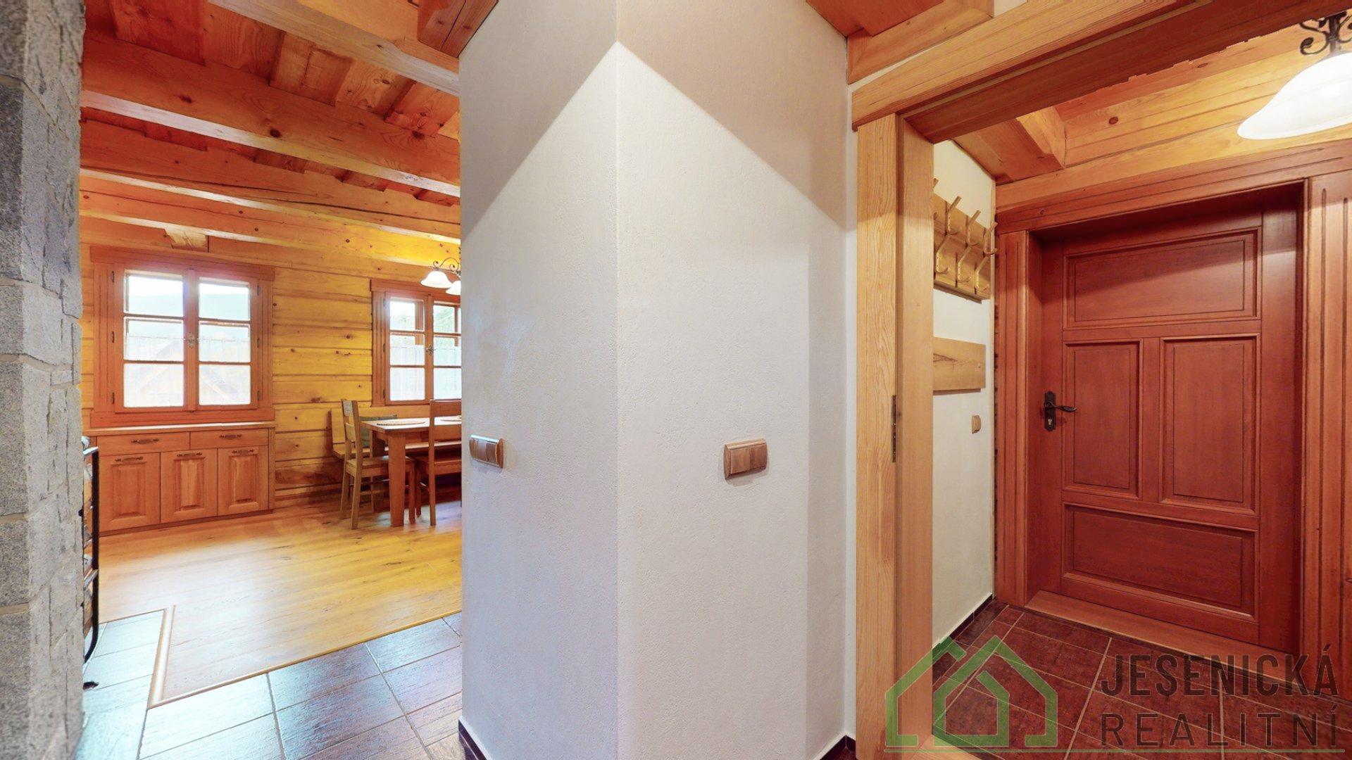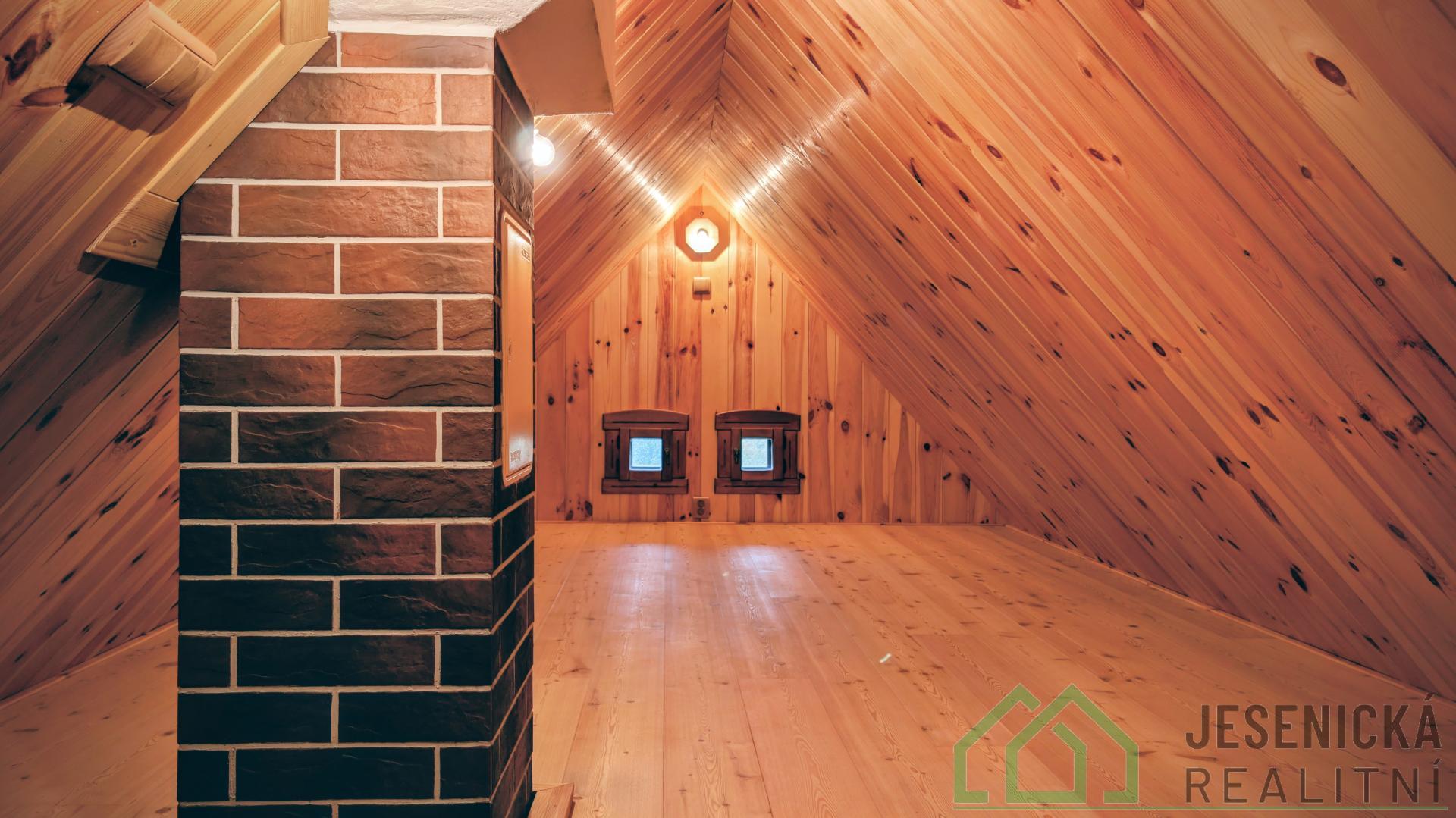 V jednom pokoji se nachází vstup se schodištěm do půdního prostoru s jasanovou podlahou a obkladem z borovice, který může sloužit jako další místo k přenocování.