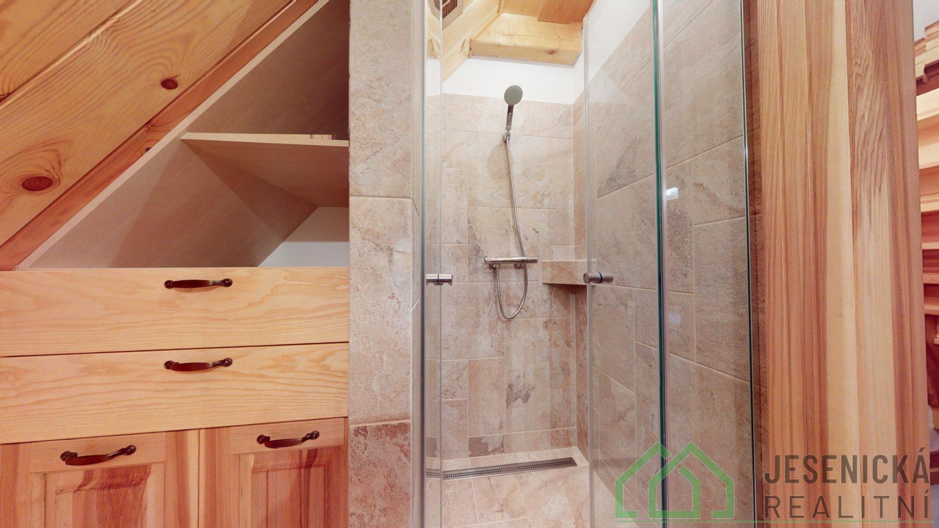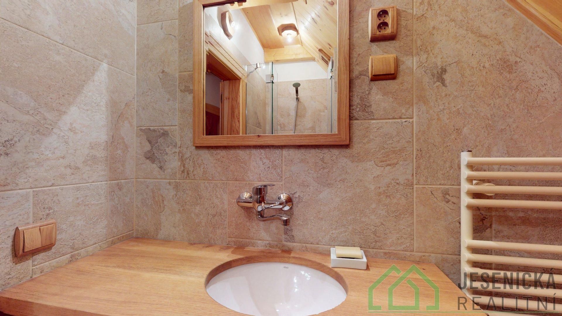2. podlaží: koupelna s WC, se sprchovým koutem a nábytkem z jasanu.