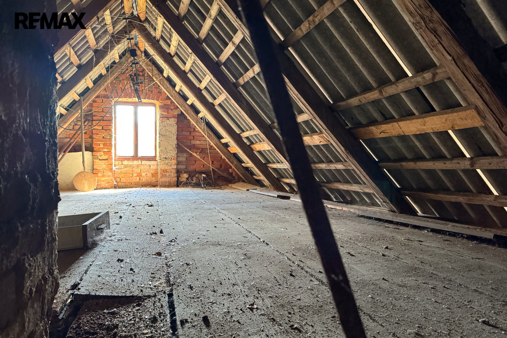 - výstup na půdní prostory, které se rozprostírají po celé ploše domu, aktuálně použitelné jako úložný prostor, s potenciálem vybudování dalších obytných místností