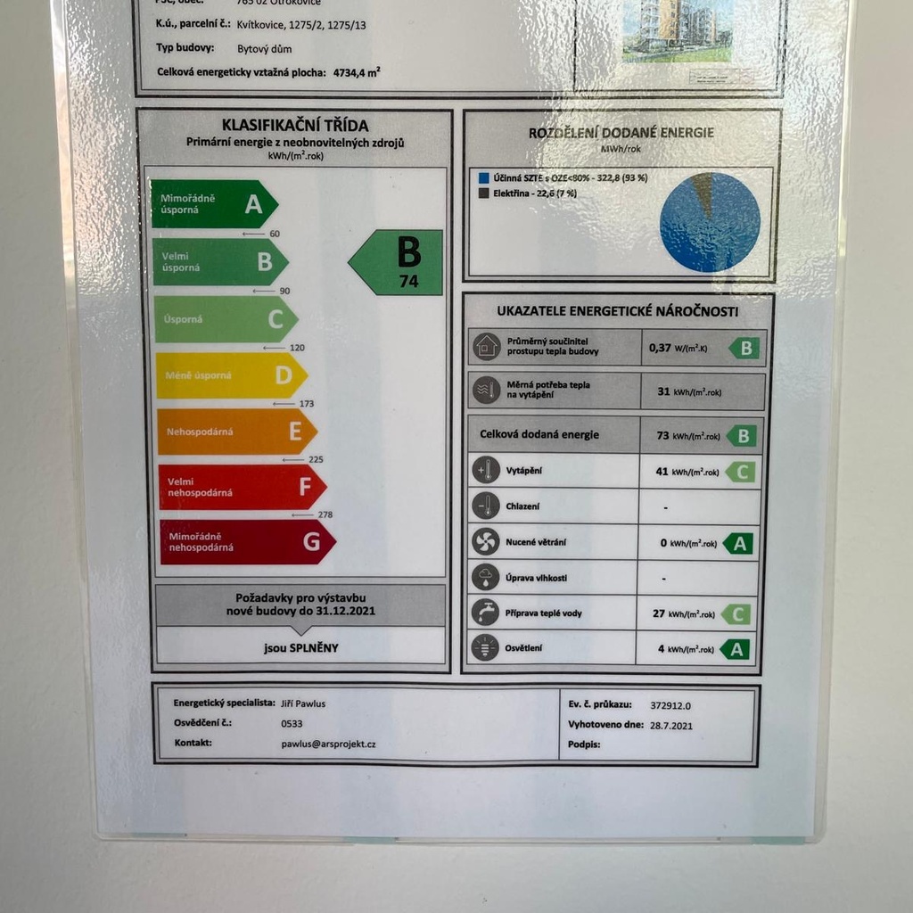 - Ukazatel energetické náročnosti budovy: 74 kWh/m²