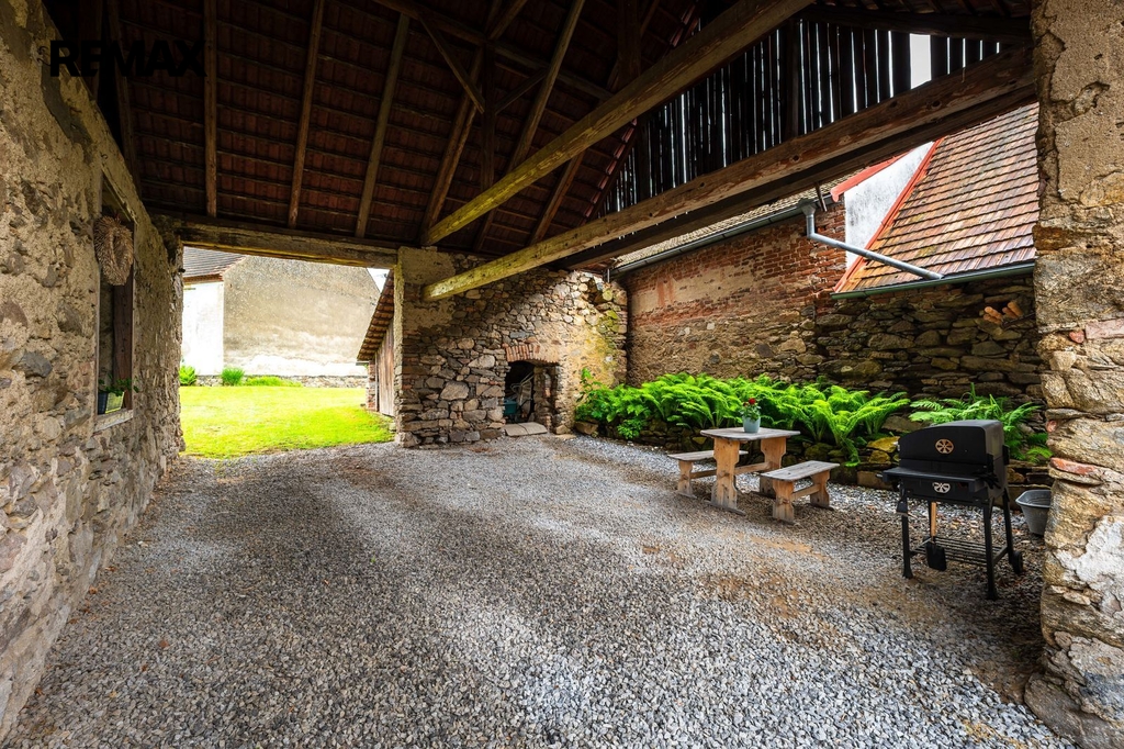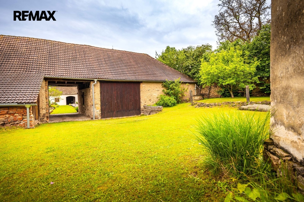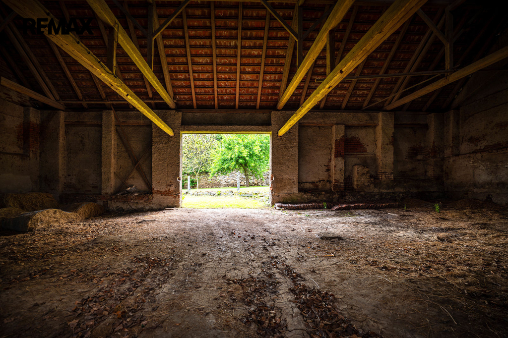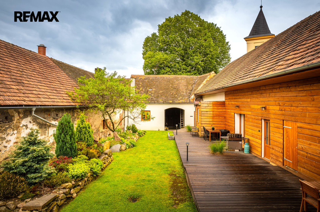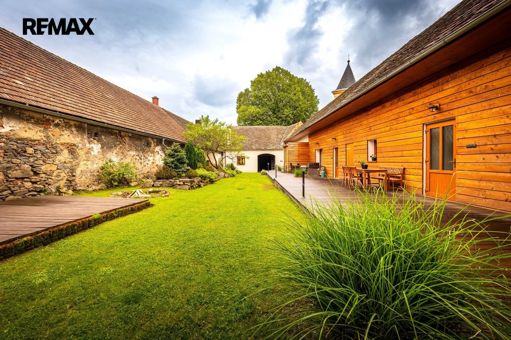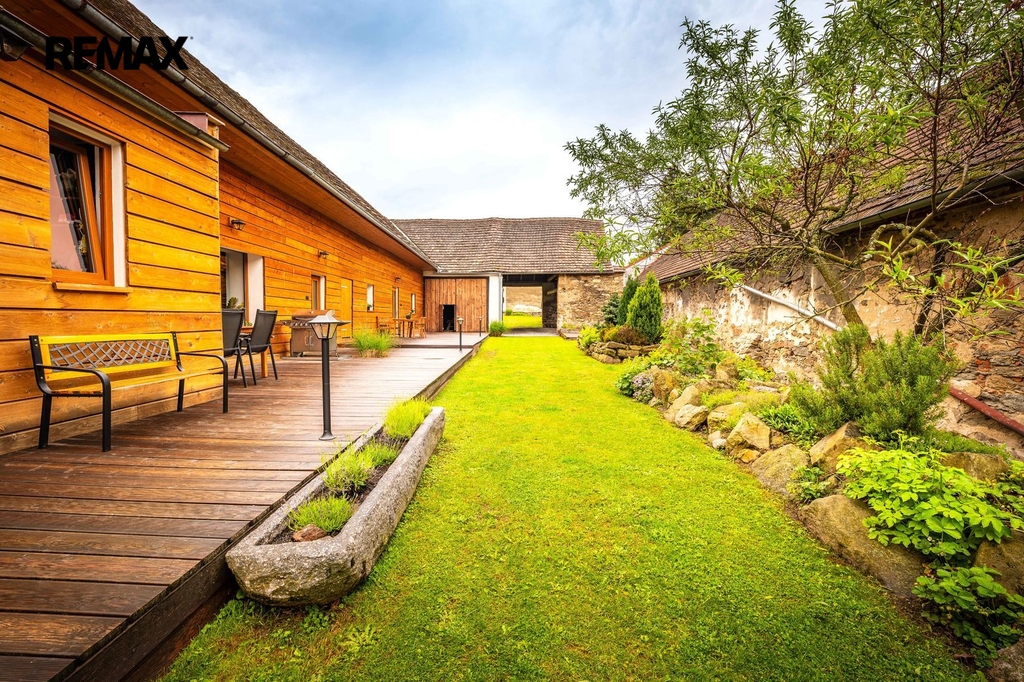 Dům s uzavřeným dvorem z přední i zadní části nabízí maximální soukromí. Dřevěná terasa podél vnitřního dvora k využití a umístění odpočinkové části, grilovací kout s ohništěm, relaxační zóna a skalky. Průjezdnou stodolou se dostanete na zahradu, na kterou je možný druhý vjezd i z hlavní komunikace. Samostatná stodola o výměře 200m2 je evidována jako stavební pozemek, možnost rekonstrukce a oddělení. V případě zájmu možnost prodeje pouze stodoly se zahradou, která je přístupná z obecní komunikace. Odděleno by bylo geometrickým plánem. Dům je možný použít pro účely rodinného bydlení či vícegeneračního bydlení, ale také komerční. Celková výměra pozemku je 1624m2, obytná plocha má výměru 363m2, plocha stodol a technických místností je 408m2.
