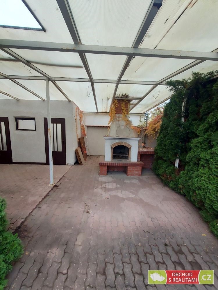 Na zahradě se nachází garáž pro jedno auto (další parkovací místa jsou na vlastním pozemku před garáží), bazén, terasa s krbem a skleník.