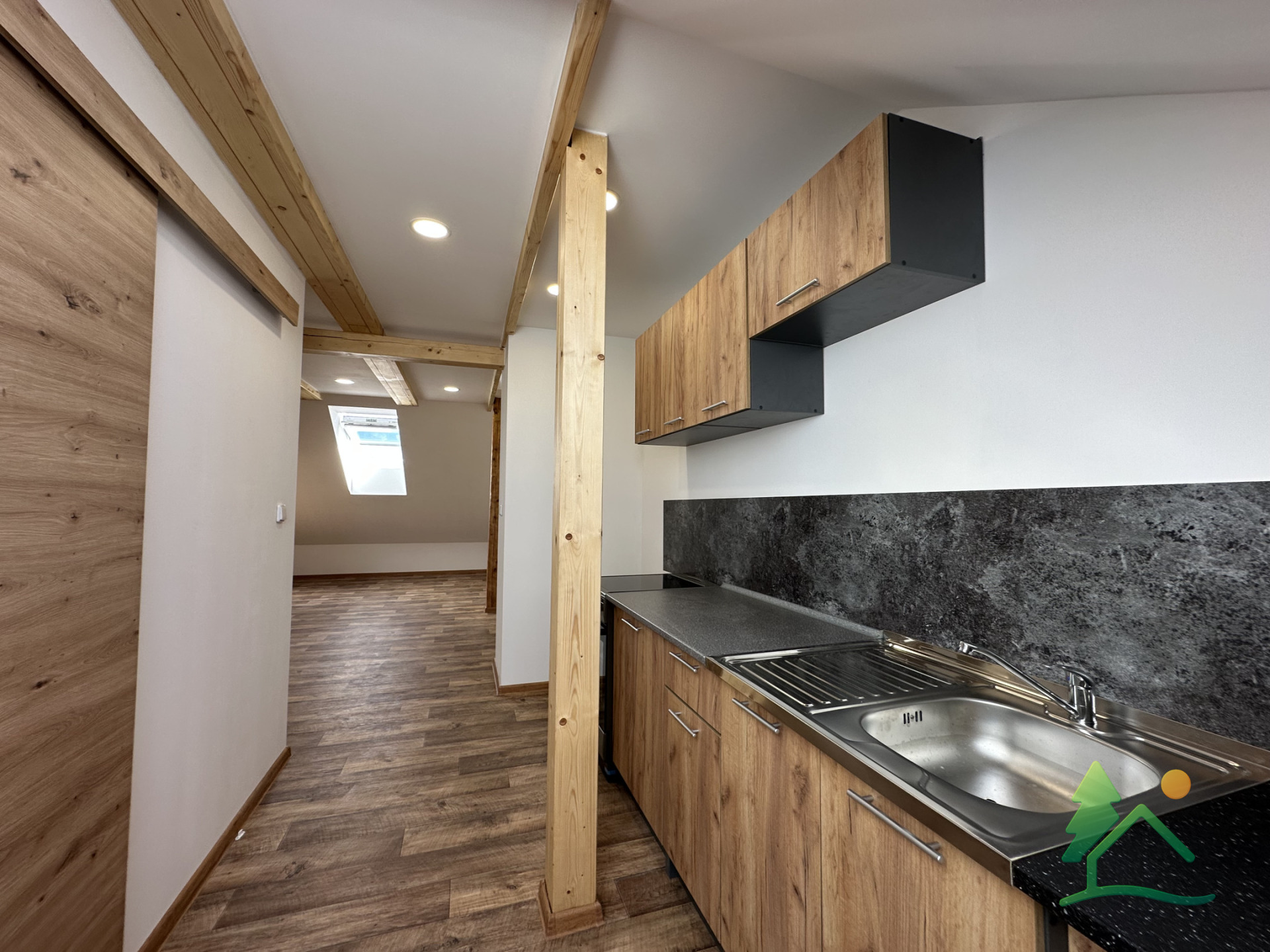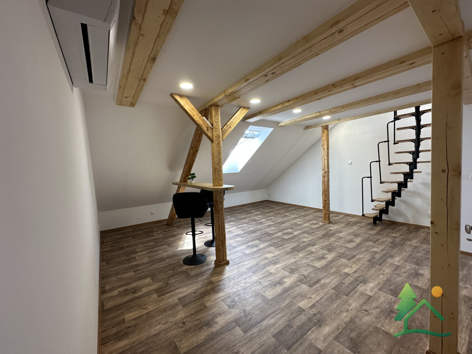 Byt je řešen jako mezonet – ve spodní části se nachází obytný prostor s kuchyňským koutem a koupelna se sprchovým koutem. V horním patře je umístěna útulná ložnice, která poskytuje dostatek soukromí.