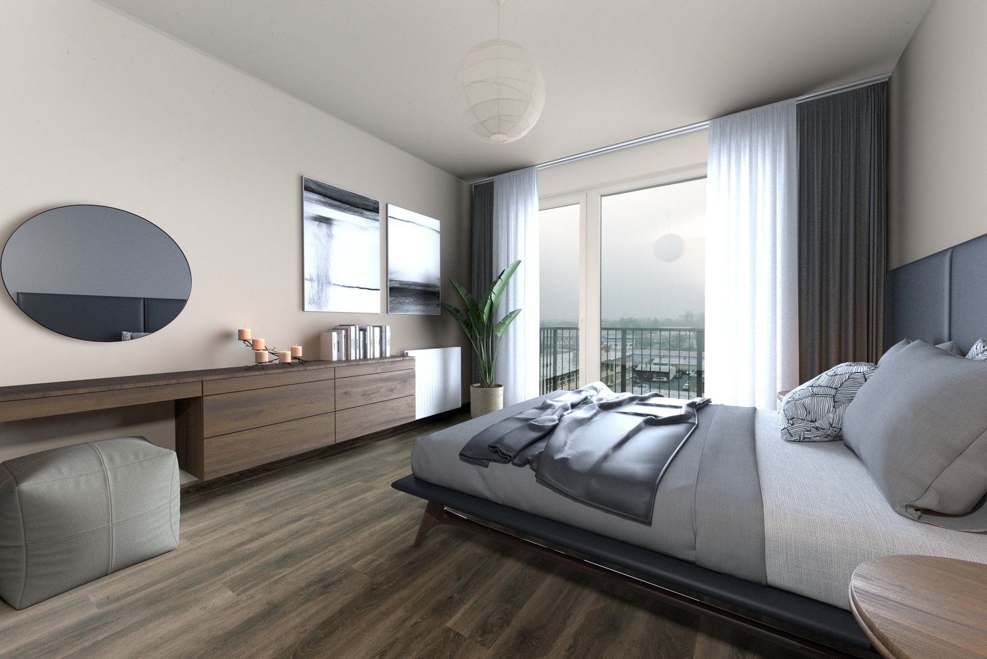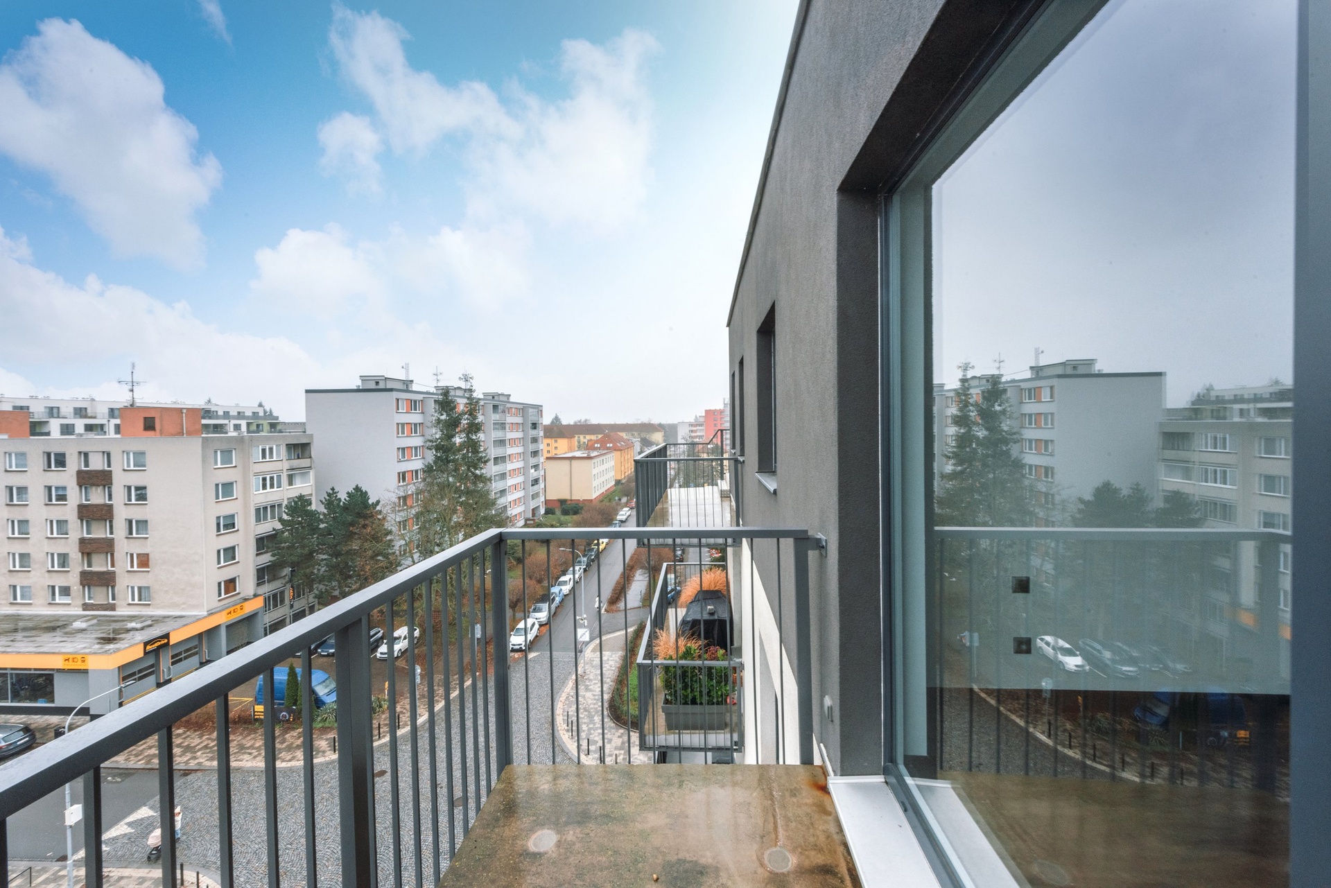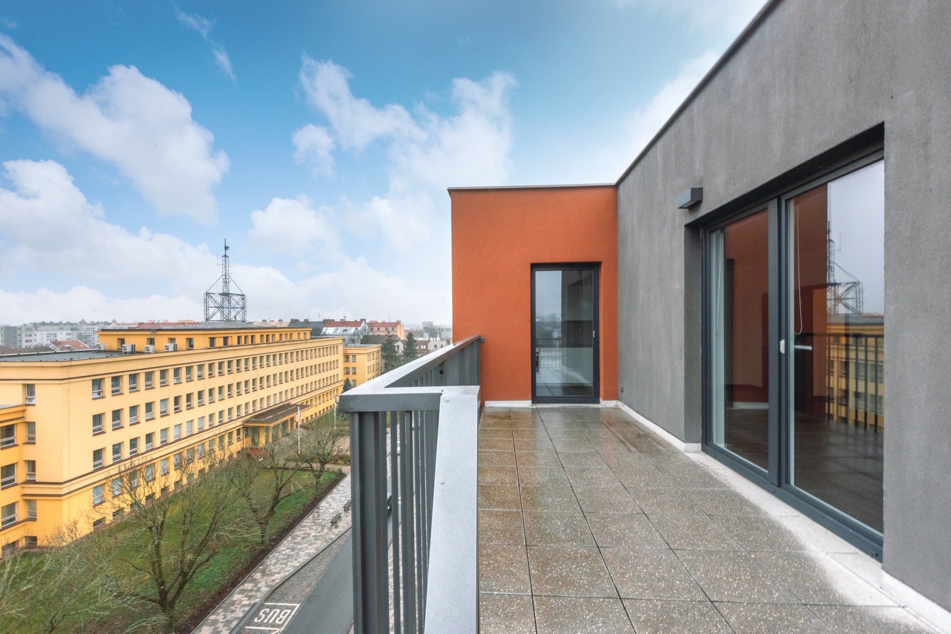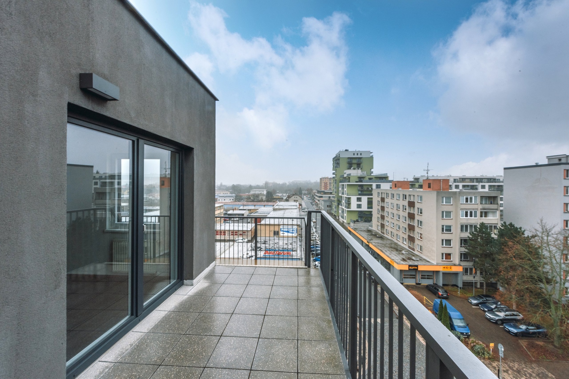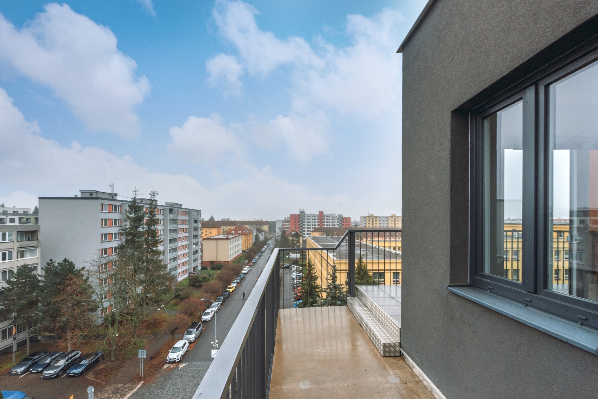 Nacházíme se v nejvyšším podlaží a nad námi tedy nikdo nebydlí, což zajišťuje zmiňované soukromí. Výhled z bytu není orientován do vnitrobloku, takže vás neruší pohled do oken jiných bytů. Prostorná terasa, též orientovaná na jihovýchod je přístupná z obývacího pokoje. Obě ložnice směřují na východ a jsou prosvětlené již od rána. Hlavní ložnice se vstupem na balkon nabídne 15,5 m2, druhá pak 14,7 m2.