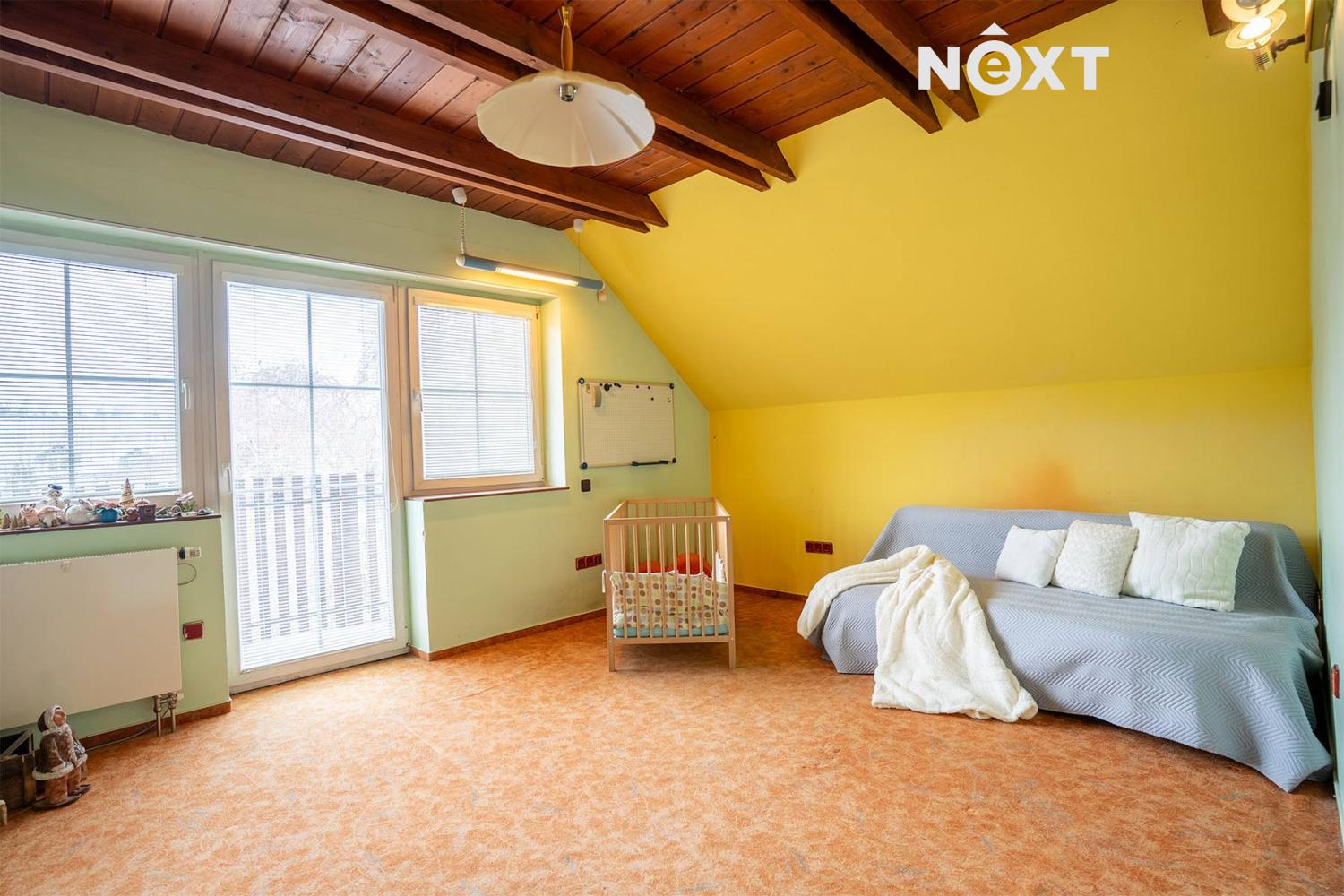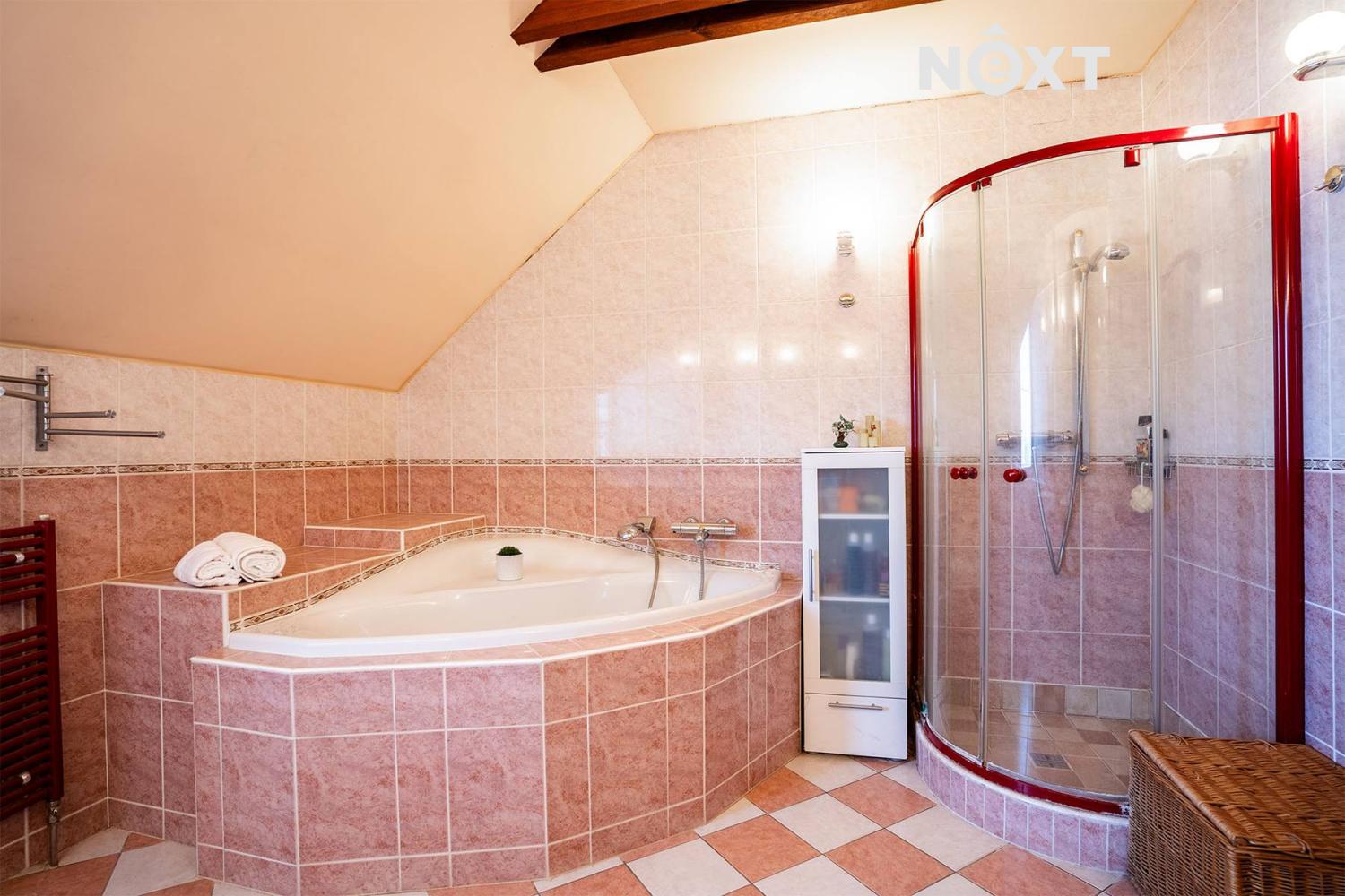 Z haly vystoupáte po točitém schodišti do patra, kde jsou 3 ložnice a druhá koupelna s rohovou vanou a sprchou i samostatné WC. V patře jsou také dvě komory.
