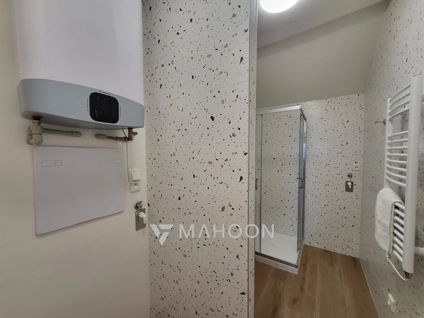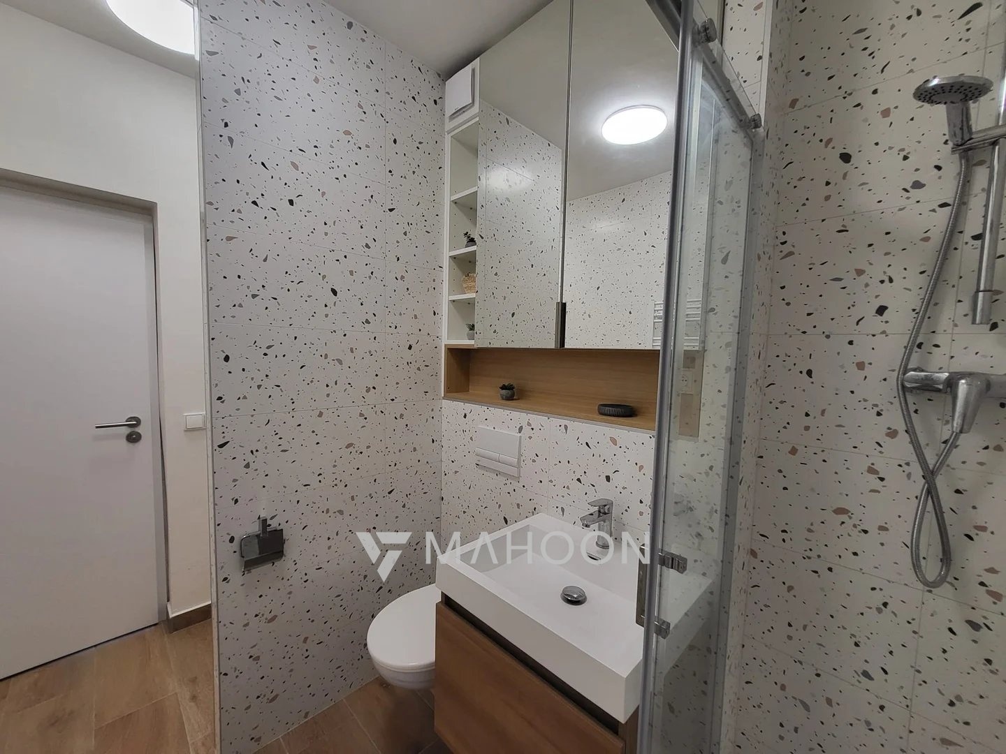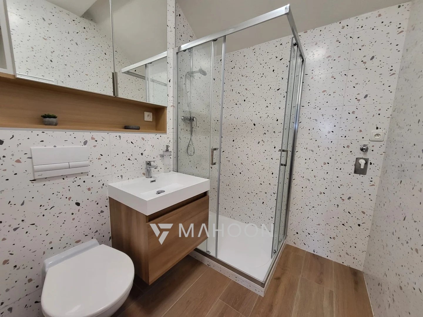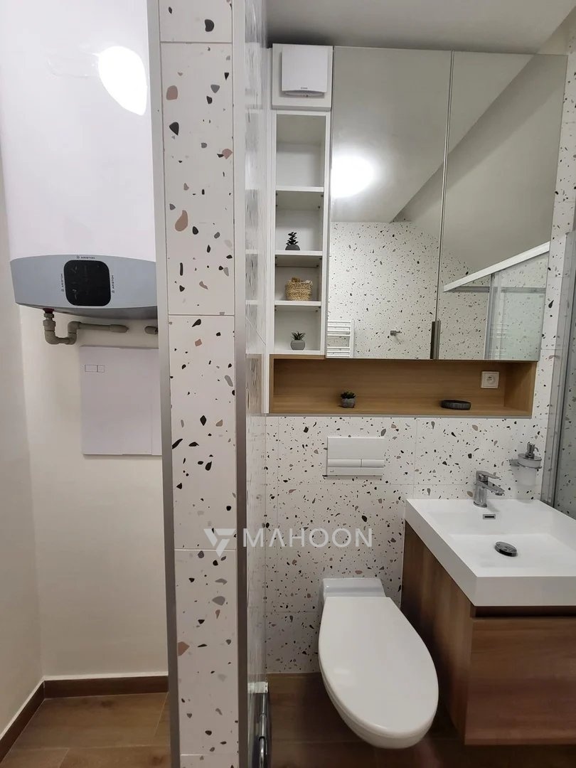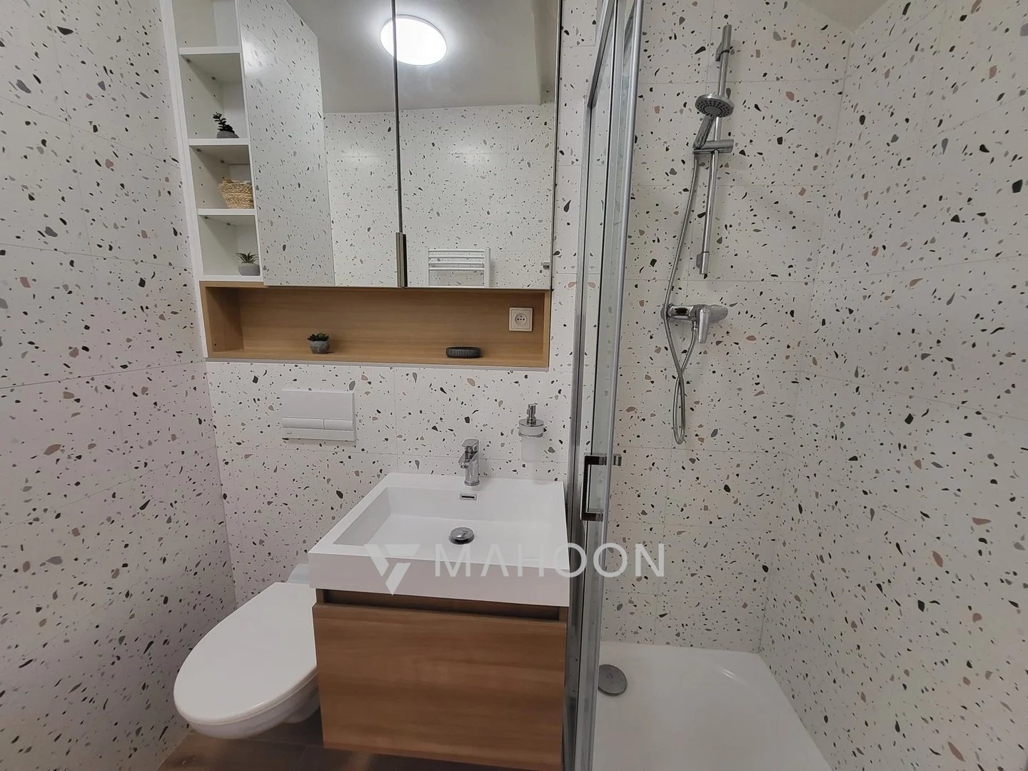 • novou stylovou koupelnu se sprchovým koutem, závěsným WC, topným žebříkem, designovým bojlerem a pračkou,