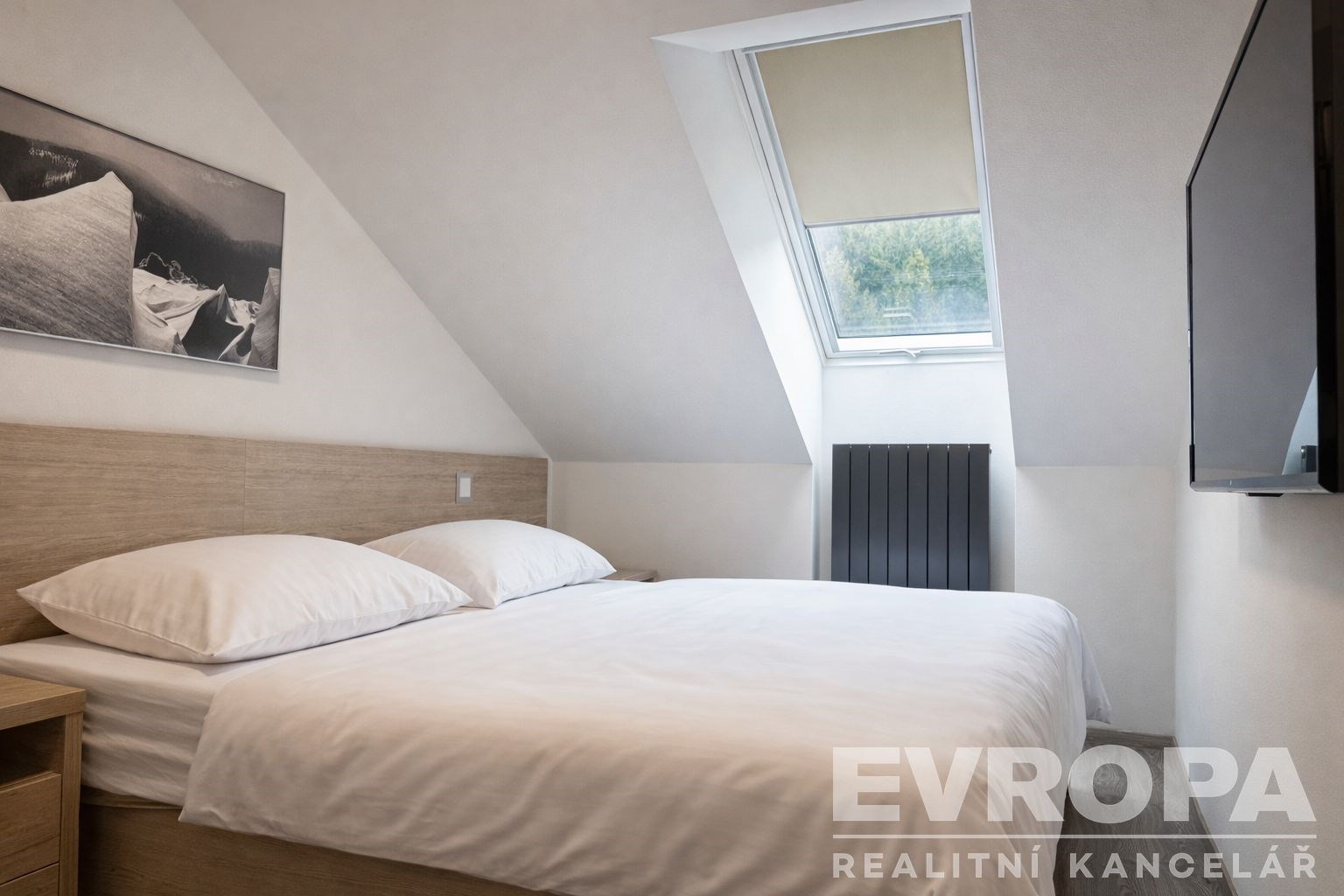 Po vnitřním schodišti se dostanete do podkroví, kde se nachází ložnice a prostorná koupelna s velkoformátovými obklady, vanou, umyvadlem a přípravou na pračku.