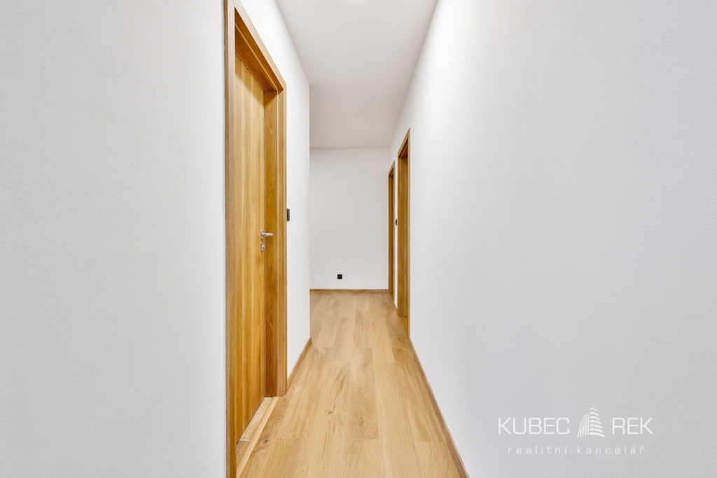 Nově řešená dispozice nabízí dostatek prostoru pro pohodlný rodinný život. Obývací část s kuchyní tvoří přirozené centrum bytu, zatímco samostatné pokoje poskytují dostatek soukromí rodičům i dětem.
