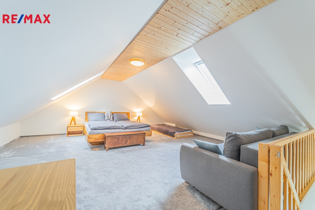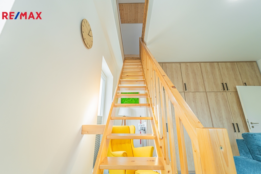 Do zvýšeného patra se jde po dřevěných schodech. Zde se vám poté otevře velký prostor (35 m2), který se dá rozdělit na dvě menší místnosti. Jsou tady dvě střešní okna se žaluziemi, manželská postel, gauč (válenda) a sófa. Celý byt je pokrytý moderní dlažbou, jen v horním patře je položený koberec, který celou místnost zatepluje a zútulňuje.
