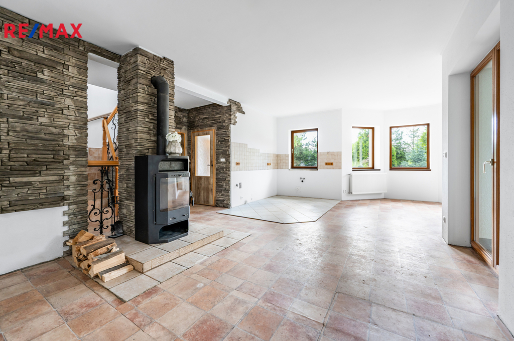 Dům o užitné ploše 157,8 m² nabízí komfortní zázemí v přírodě. V přízemí se nachází vstupní chodba se sprchovým koutem a toaletou, zasklená zimní zahrada, obývací prostor s přípravou na kuchyň, technická místnost s bojlerem Vaillant (120 l). Vytápění zajišťují krbová kamna a centrální radiátory.