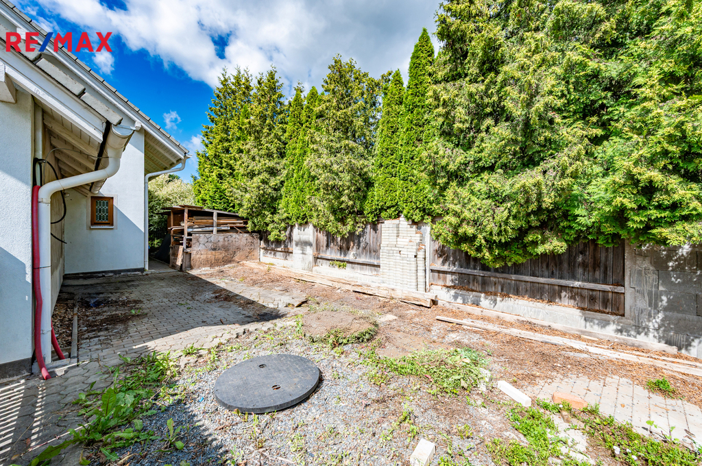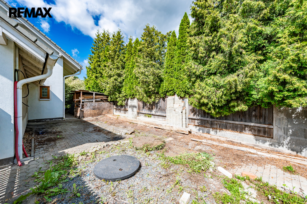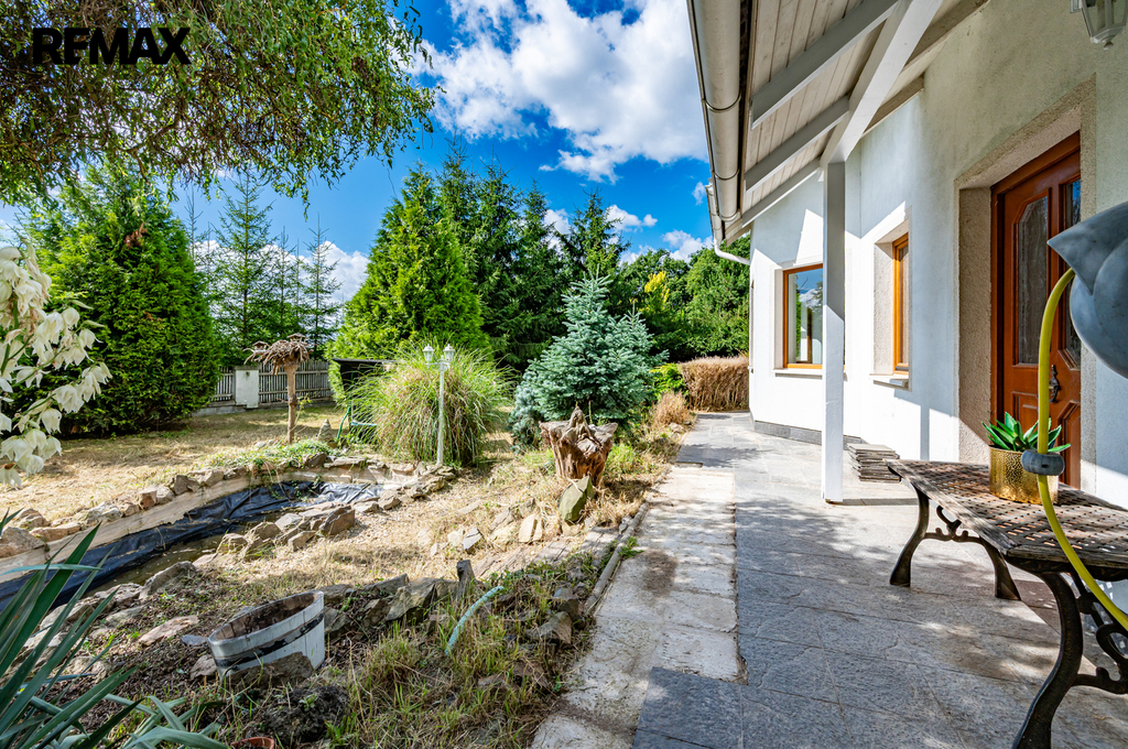 Zahrada nabízí naprosté soukromí, umělé jezírko, připravené místo na vířivku nebo bazén, zahradní osvětlení, vzrostlé jehličnany, vrby, túje i originální „falešnou studnu“. Voda je zajištěna vlastní vrtanou studnou (cca 18 m), u domu je připravena přípojka na obecní vodovod (2024). Odpad je řešen septikem (6–9 m³), elektřina pro čističku přivedena – stačí povolení.