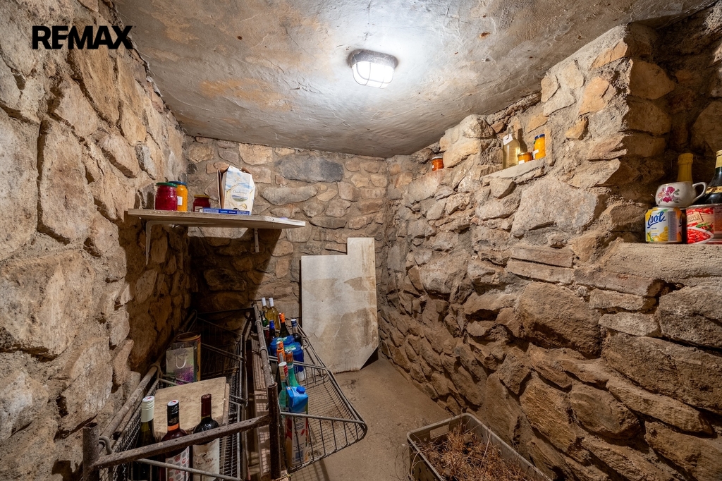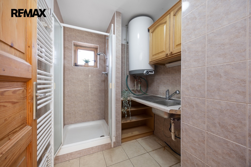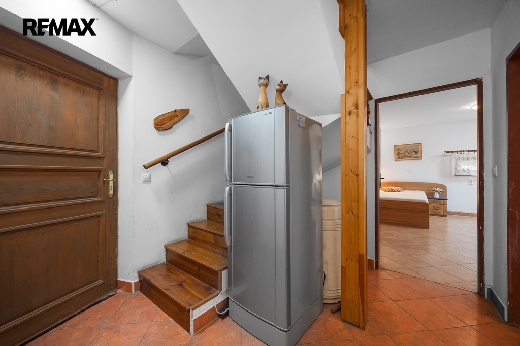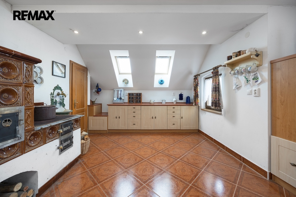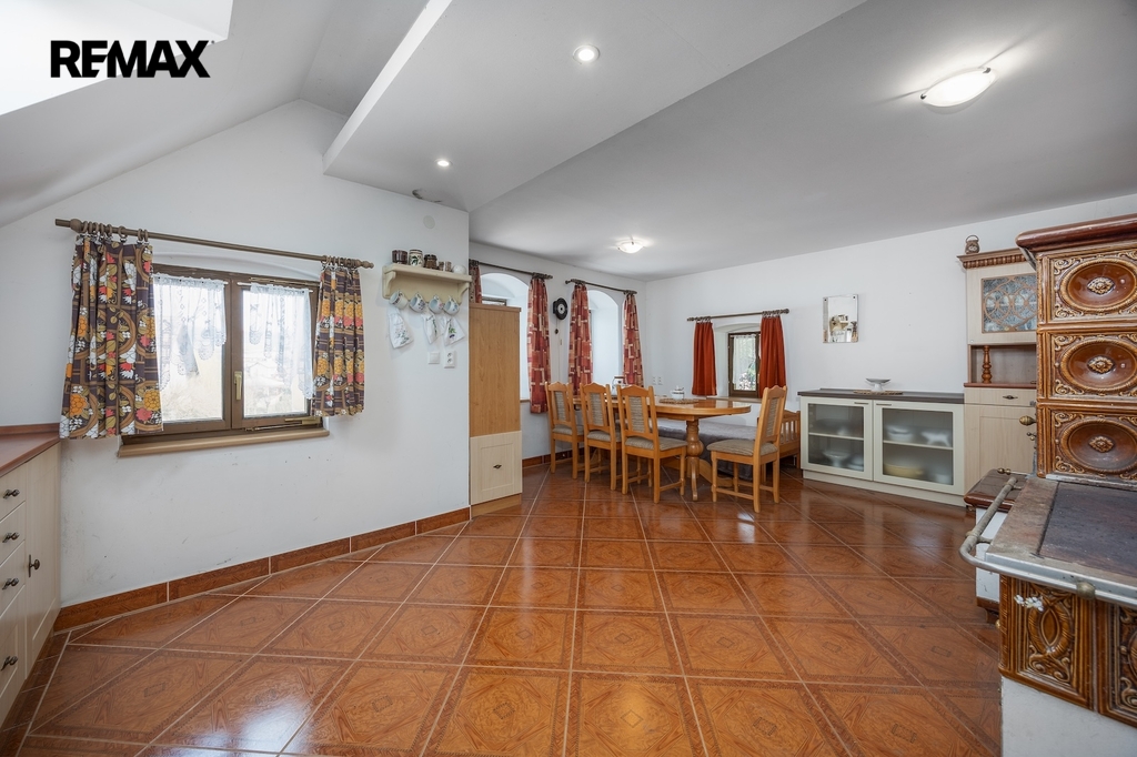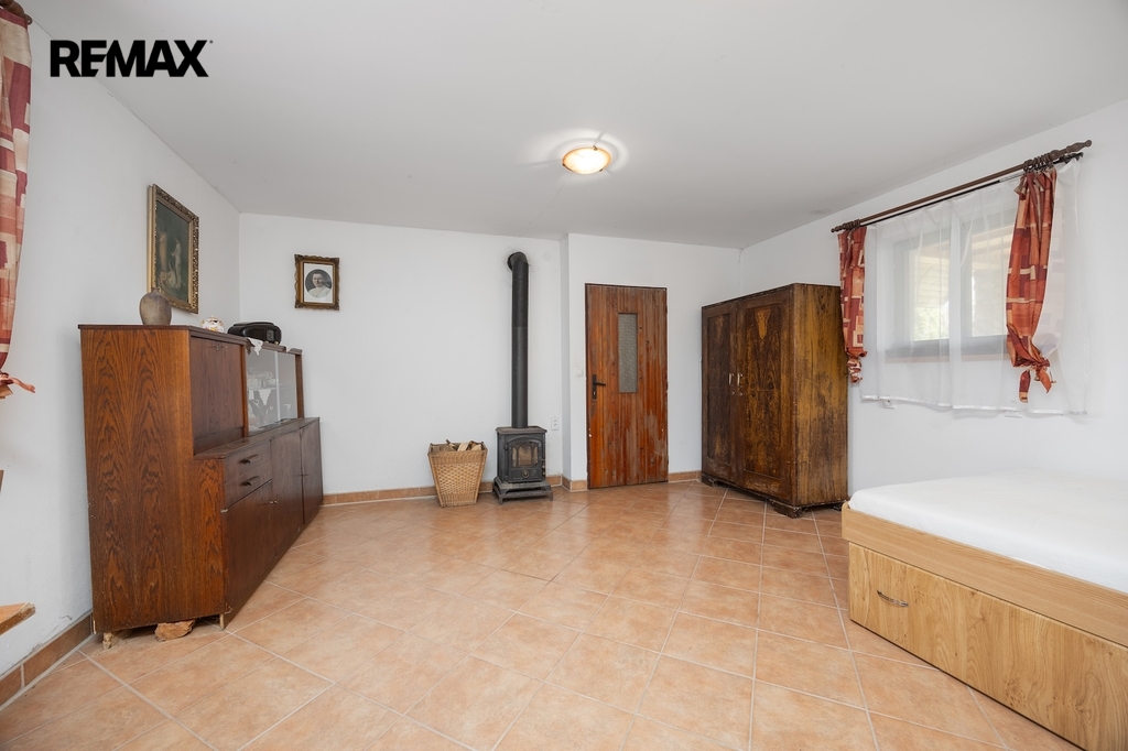 V přízemí se nacházejí dvě prostorné místnosti, které tvoří srdce celé chalupy. Hlavní obytný prostor, tradiční světnice, slouží jako místo pro vaření, stolování i odpočinek. Dominantou této místnosti jsou stylová kachlová kamna, ve kterých je možné nejen topit, ale i vařit nebo péct, což podtrhuje autentickou venkovskou atmosféru. Druhá místnost v přízemí je využívána jako ložnice s pracovním koutem, vytápěná klasickými kamny, a nabízí příjemné zázemí pro spaní i klidnou práci.