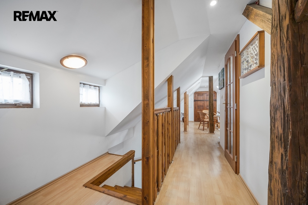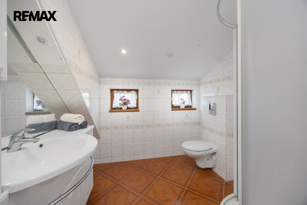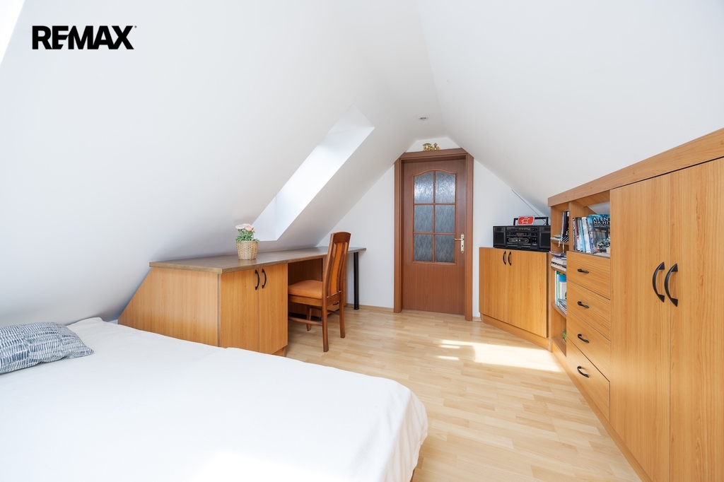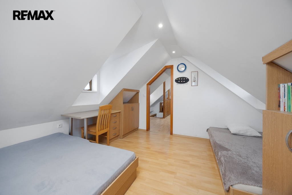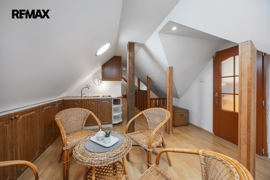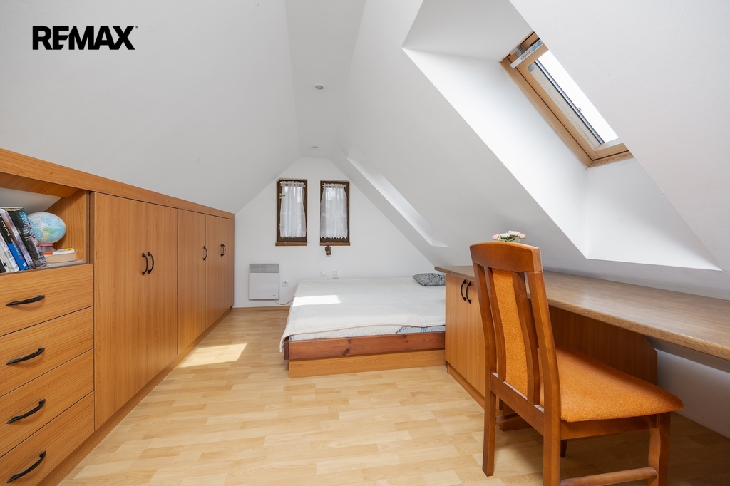V podkroví se nacházejí další dva pokoje. Jeden z pokojů je vytápěn přímotopem, druhý je bez vlastního zdroje vytápění. Na chodbě v podkroví je navíc příjemné posezení, které vytváří další prostor pro relaxaci. Komfort užívání zvyšuje skutečnost, že jak v přízemí, tak i v podkroví je k dispozici koupelna se sprchovým koutem a toaletou.