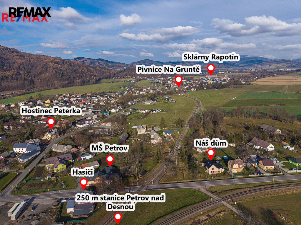 Nemovitost se nachází ve spodní části obce Petrova nad Desnou v okrese Šumperk. Dům o dvou podlažích a celkové podlahové ploše 145 m² prošel částečnou rekonstrukcí. V přízemí je k dispozici předsíň, tři obytné pokoje, kuchyně, koupelna a technická místnost.