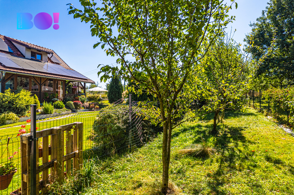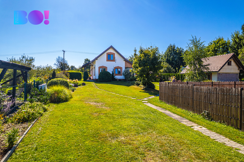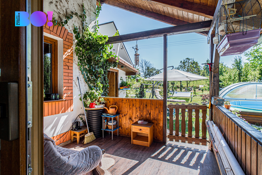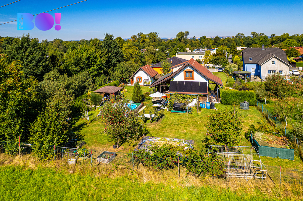 Opečovávaná zahrada s ovocnými keři a stromy má okrasnou, užitkovou a odpočinkovou část s krytým bazénem a s altánek dovolující posezení ve stínu. Zděný domek v rohu zahrady může po dokončení sloužit k celoročnímu bydlení anebo ihned pro podnikání v drobných službách.
