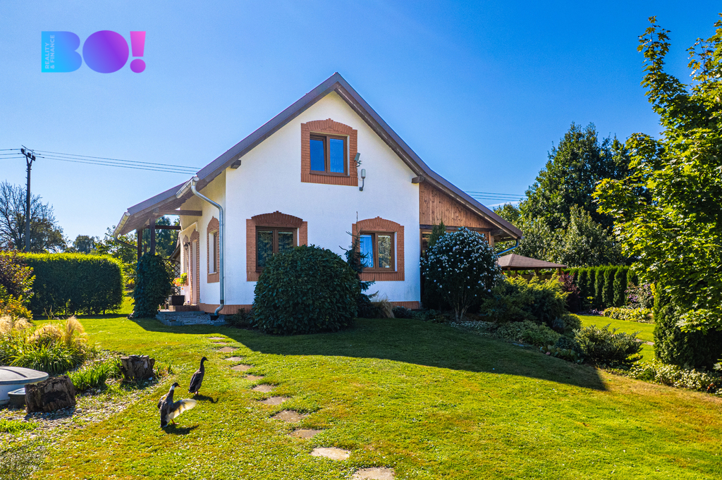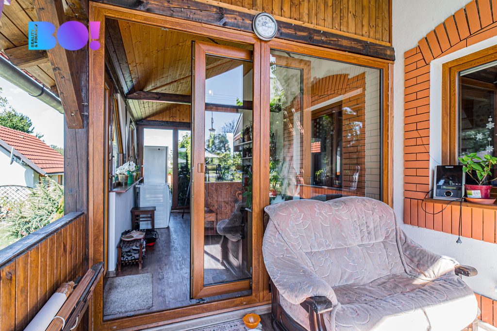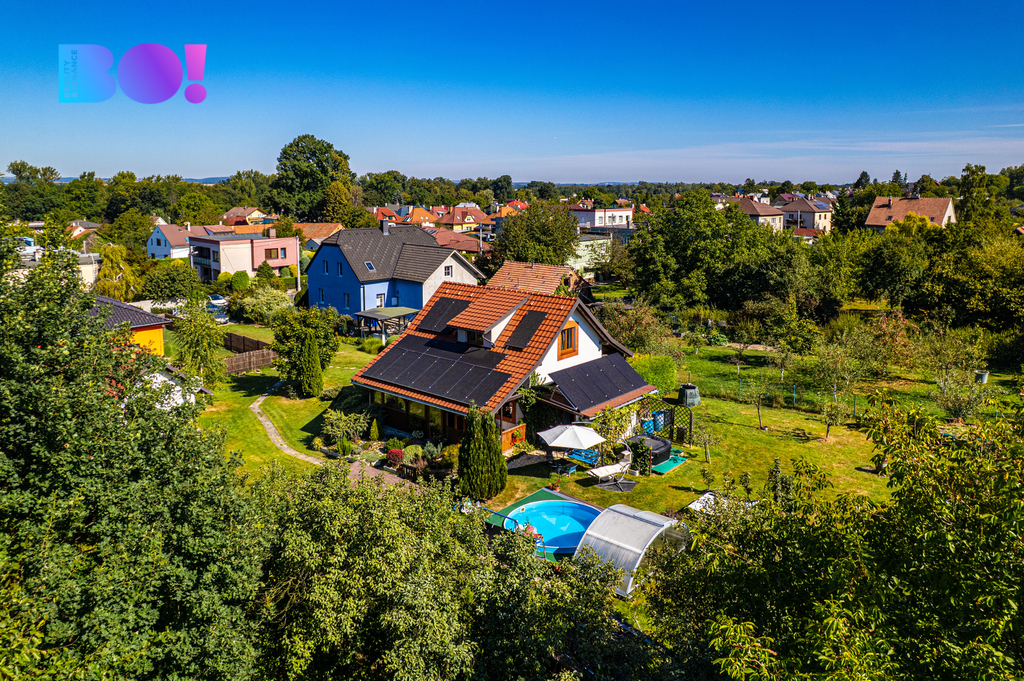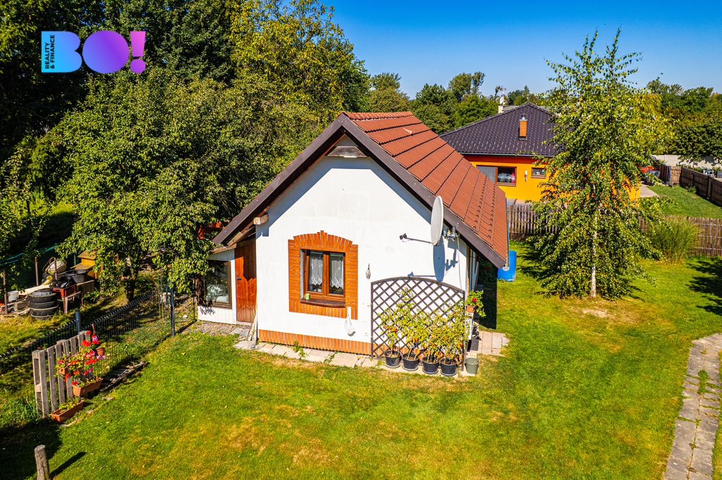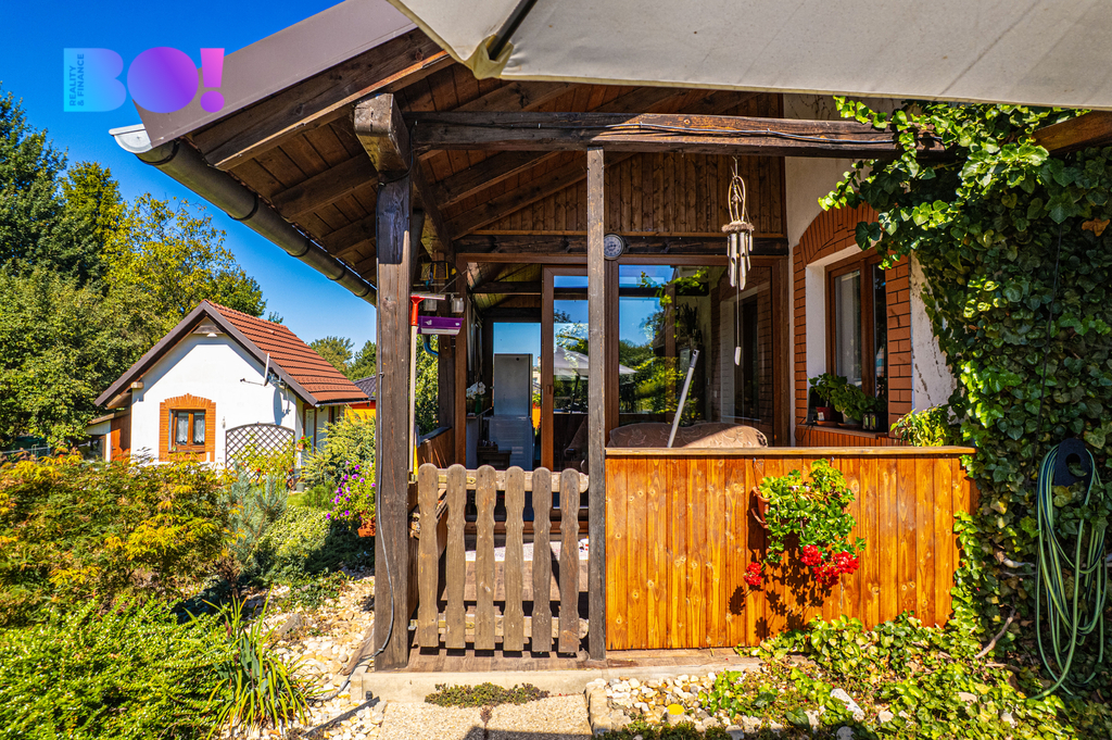 Opečovávaná zahrada s ovocnými keři a stromy má okrasnou, užitkovou a odpočinkovou část s krytým bazénem a s altánek dovolující posezení ve stínu. Zděný domek v rohu zahrady může po dokončení sloužit k celoročnímu bydlení anebo ihned pro podnikání v drobných službách.