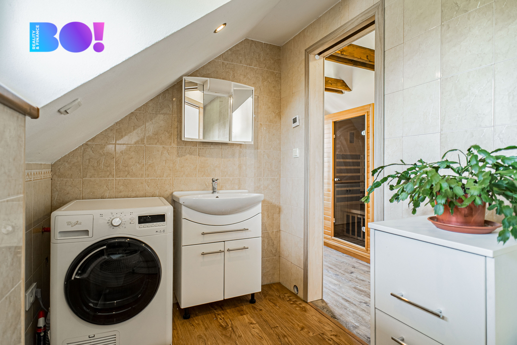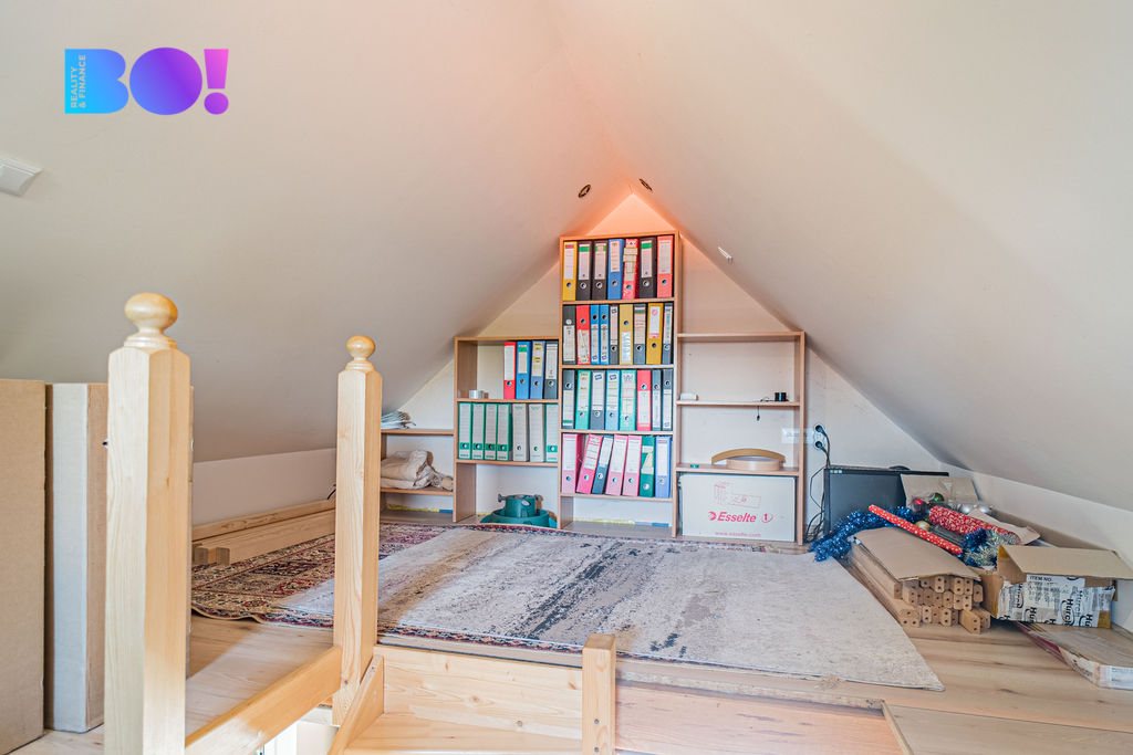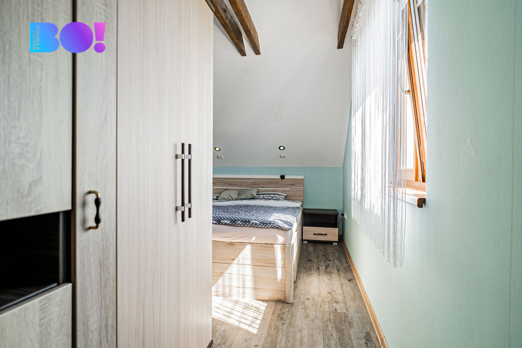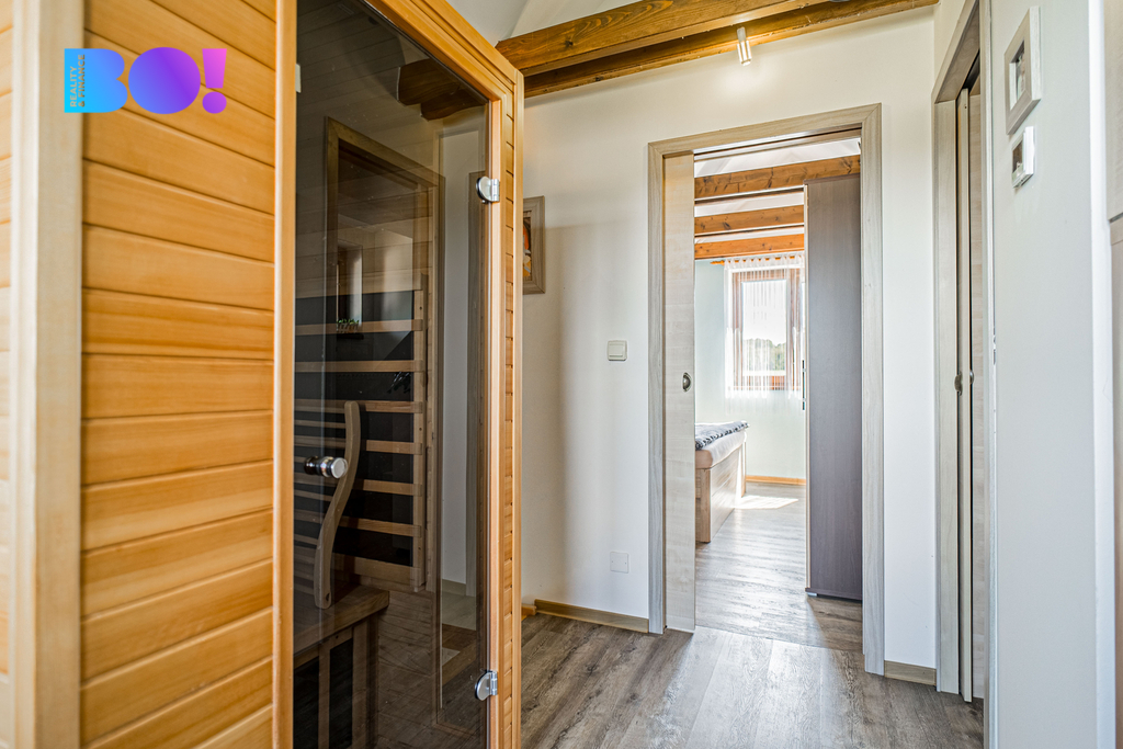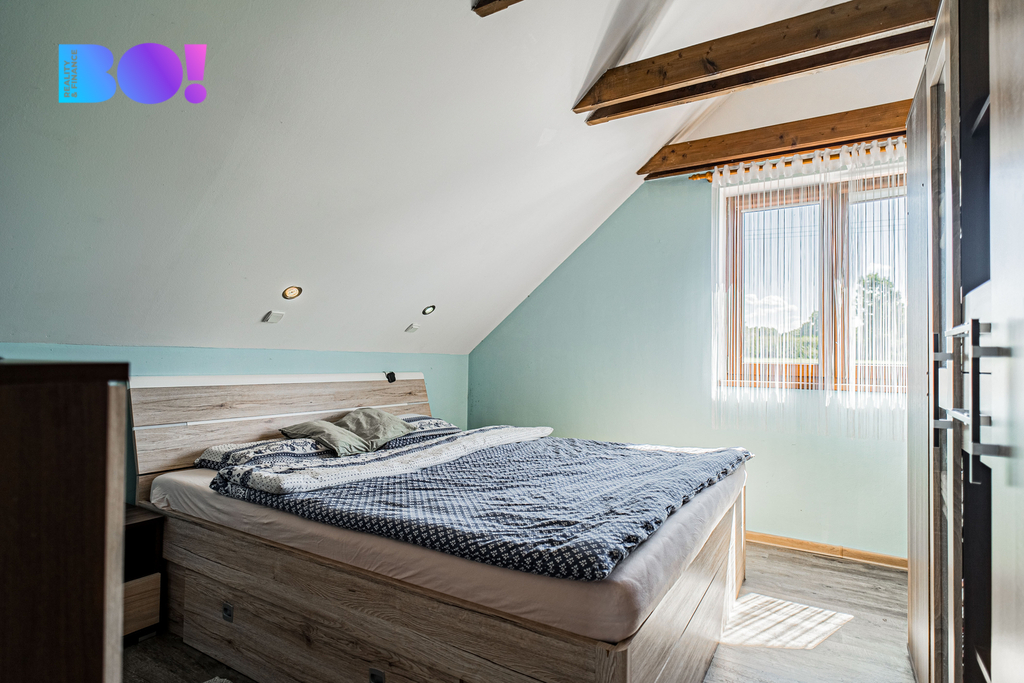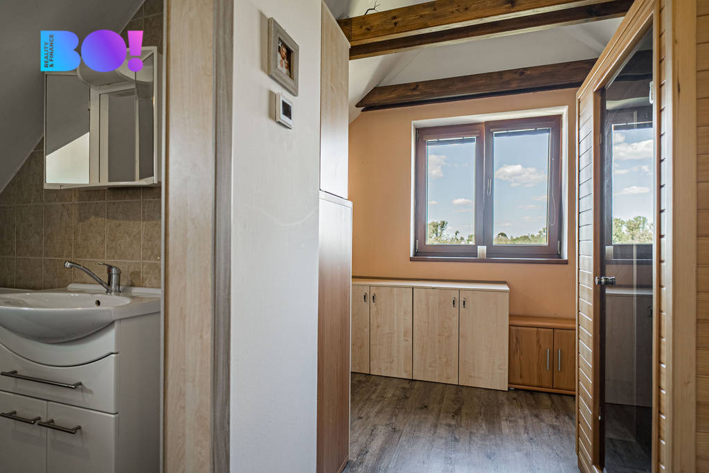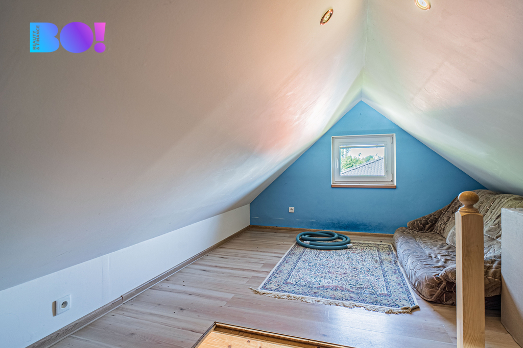 V horním patře je ložnice, otevřený pokoj/pracovna se šatnou a koupelna.