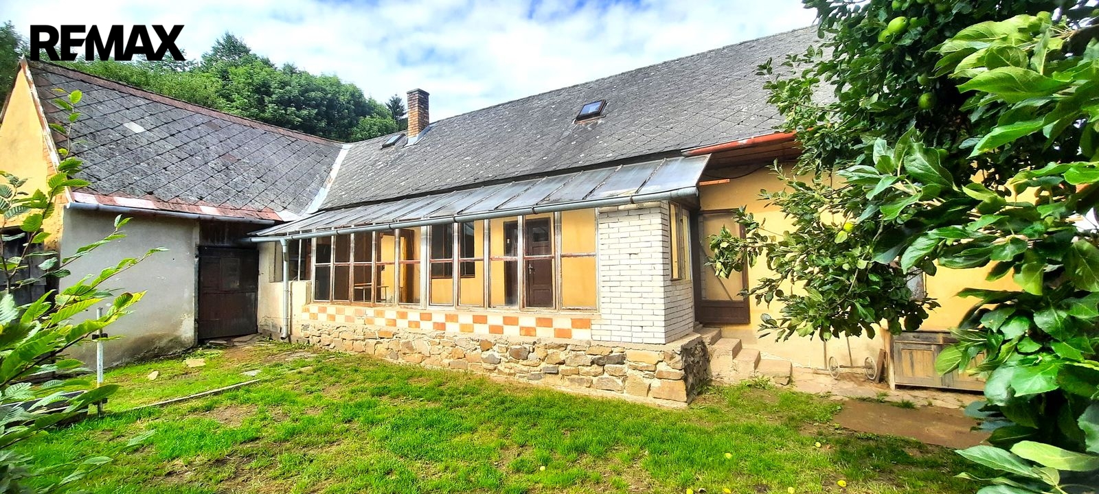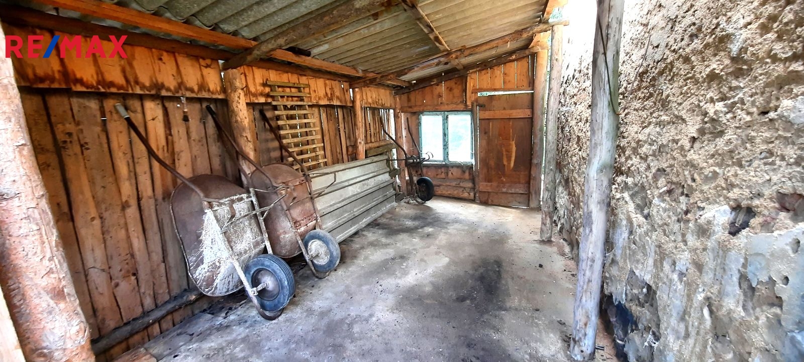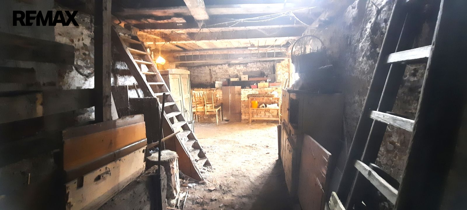 Dispozice: do domu se vchází prosklenou terasou, která vede až ke stodole za domem. Do samotné obytné části domu se z terasy vchází vpravo přes malou chodbičku přímo do kuchyně. Vlevo vedle kuchyně je spíž a dále koupelna s vanou, WC a kotlem na tuhá paliva. Vpravo vedle kuchyně se nachází první místnost, za kterou se směrem do ulice vchází do druhé místnosti. Terasou rovně se dostaneme do stodoly, za kterou se nachází zahrada a vnější menší sklep. Vedle stodoly stojí malá kůlna. Poměrně prostorná půda nabízí možnost půdní vestavby o minimálně dvou pokojích. Nemovitost je ve stavu před kompletní rekonstrukcí.