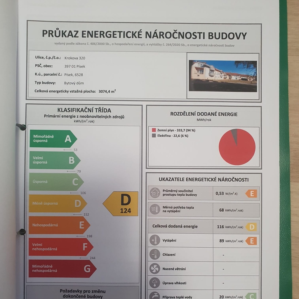 - Ukazatel energetické náročnosti budovy: 124 kWh/m²