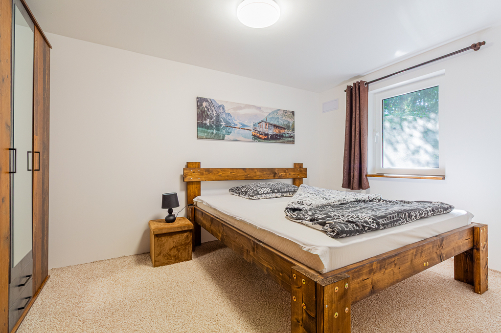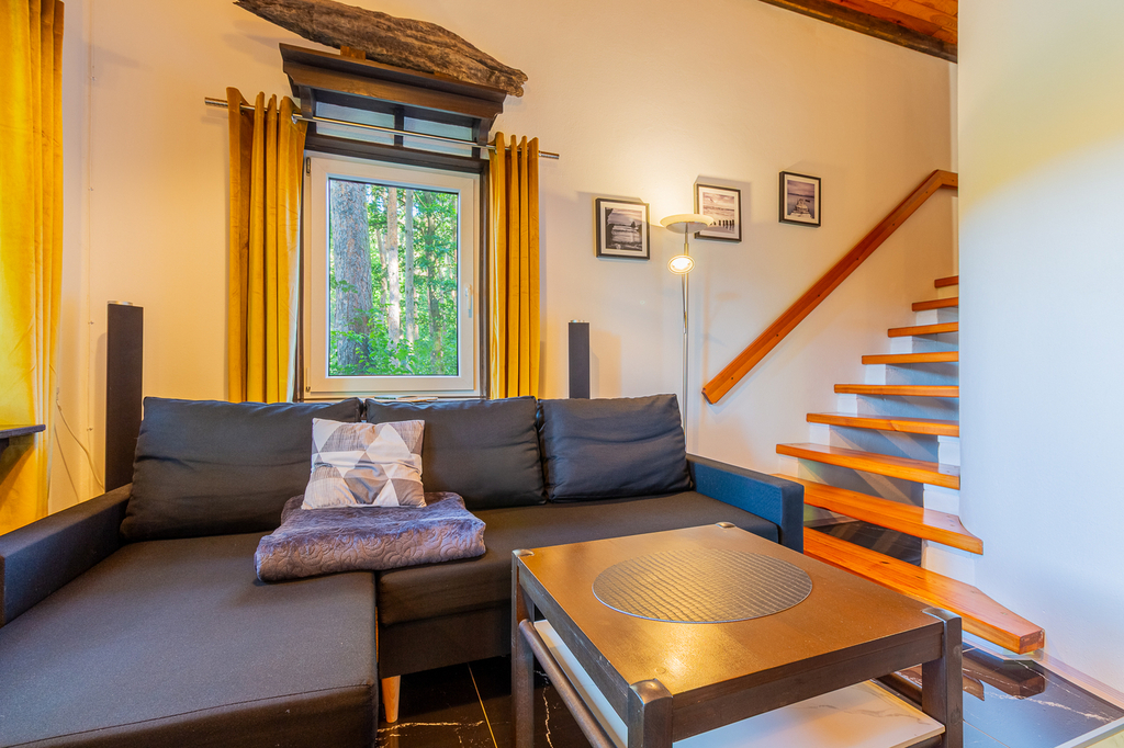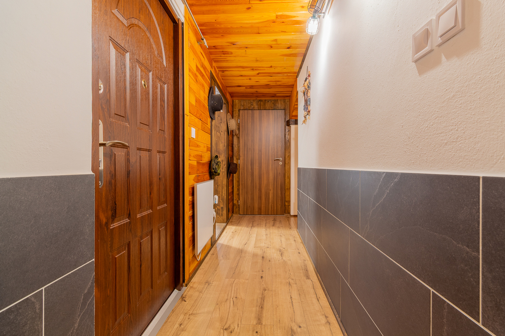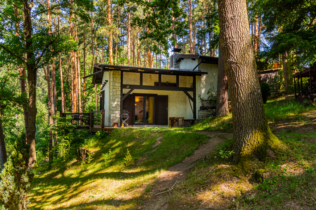 V přízemí se nachází koupelna se sprchovým koutem spojená s WC, technická místnost kde se nachází bojler, kuchyně je propojena s obývacím pokojem s krbem. V patře je ložnice a menší pokoj s další postelí a velká prosklená veranda. Chata má podlahové vytápění, kamerový systém, který lze ovládat na dálku. Tato nemovitost je jako stvořená pro milovníky rybaření, cykloturistiky i rekreačních sportů.