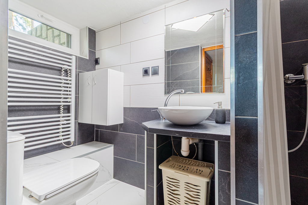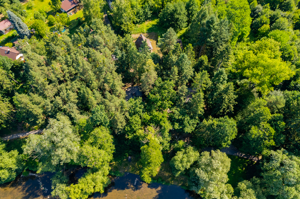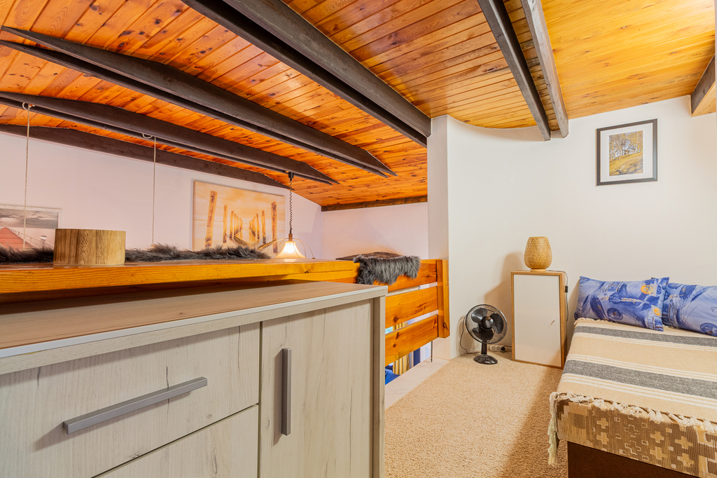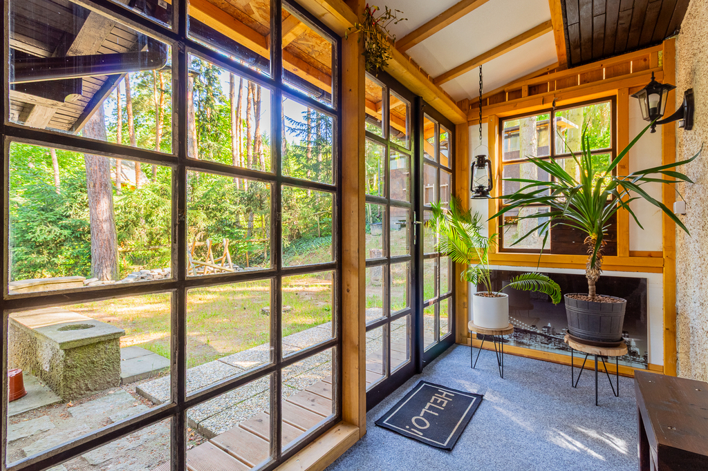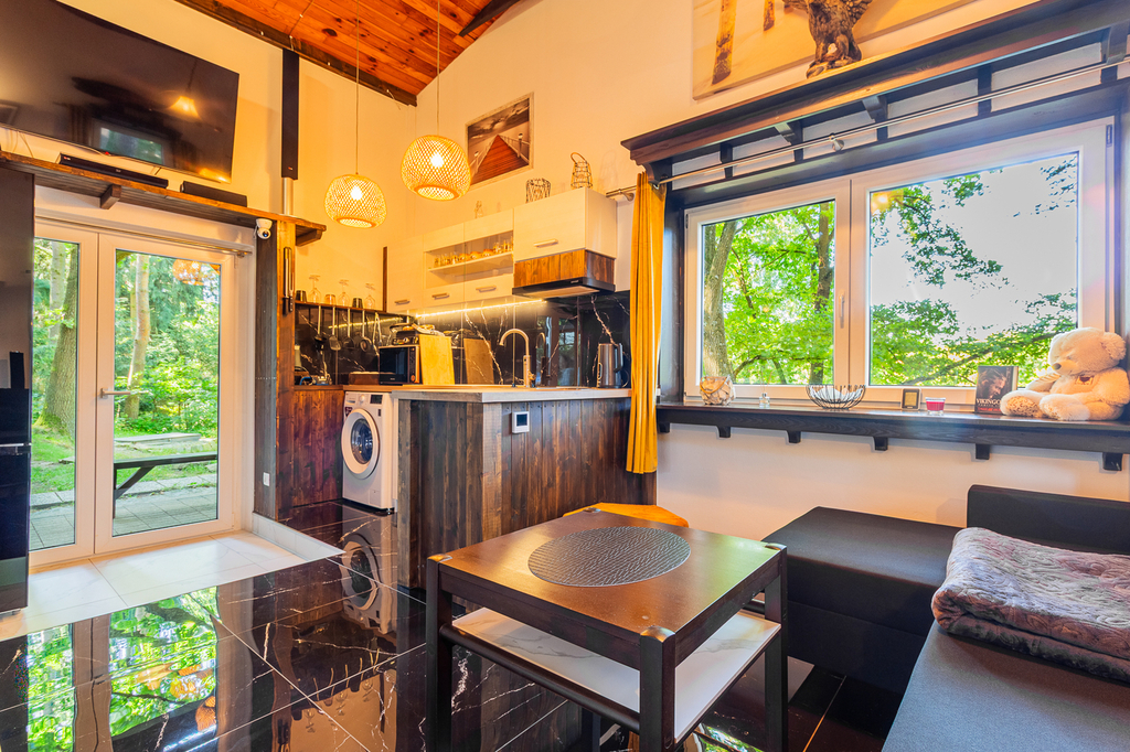 V přízemí se nachází koupelna se sprchovým koutem spojená s WC, technická místnost kde se nachází bojler, kuchyně je propojena s obývacím pokojem s krbem. V patře je ložnice a menší pokoj s další postelí a velká prosklená veranda. Chata má podlahové vytápění, kamerový systém, který lze ovládat na dálku. Tato nemovitost je jako stvořená pro milovníky rybaření, cykloturistiky i rekreačních sportů.
