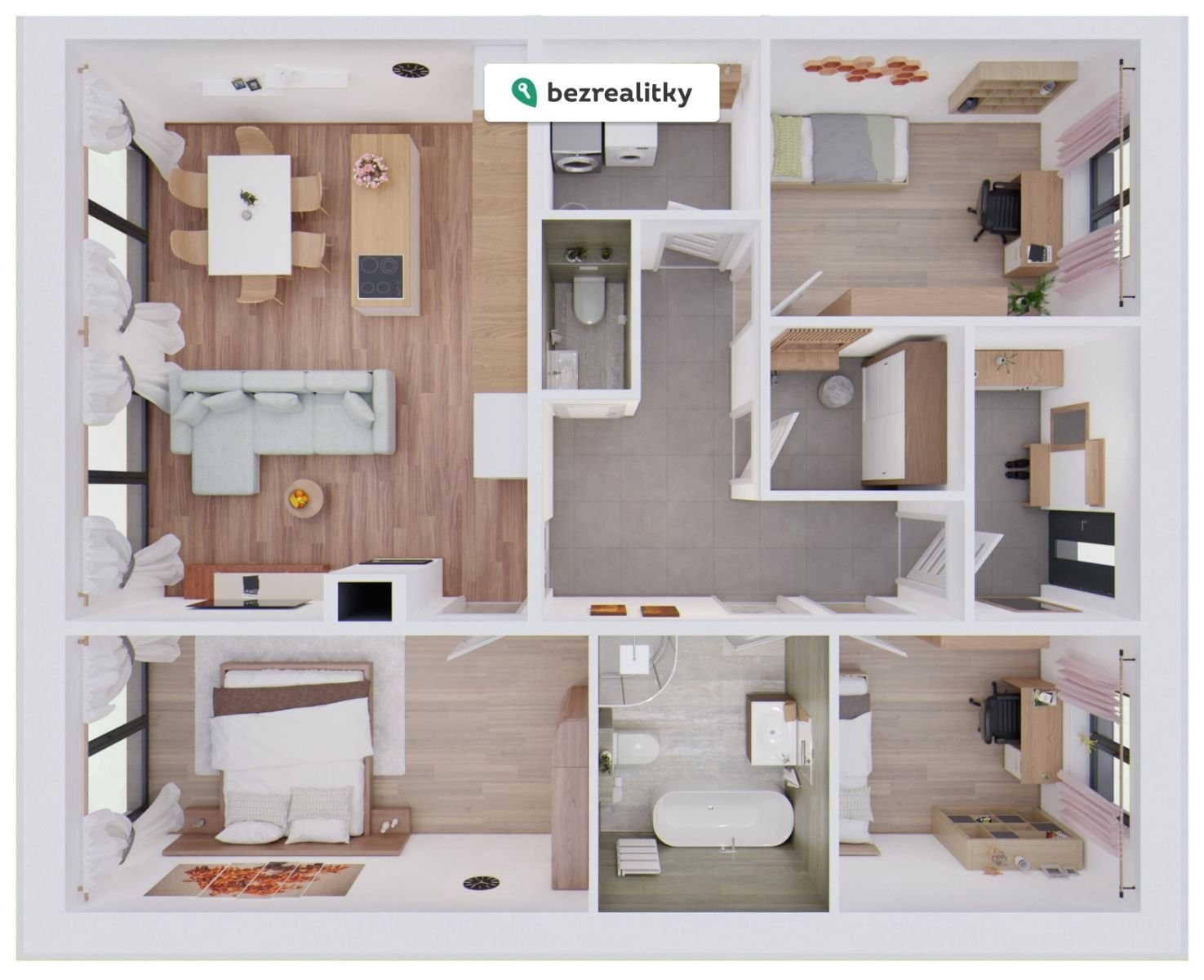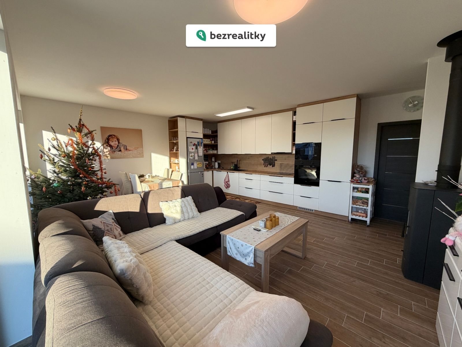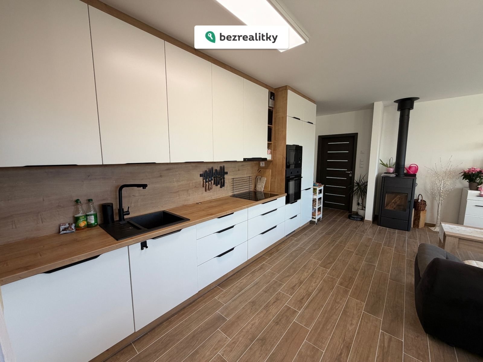 Dispozice 4+kk o obytné ploše 103,85 m2 s oplocenou zahradou, terasou a dvěmi parkovacími místy nabízí dostatek úložného prostoru i komfortní bydlení na dosah města. Nemovitost nabízí 3 velkorysé pokoje, prostornou předsíň i chodbu, prostornou koupelnu se sprchovým koutem, vanou a toaletou, samostatnou toaletu, špajz, technickou místnost a nadčasový obytný pokoj s kuchyní, krbem a výstupem na terasu, kde vzdušnou atmosféru navazují terasové portály.