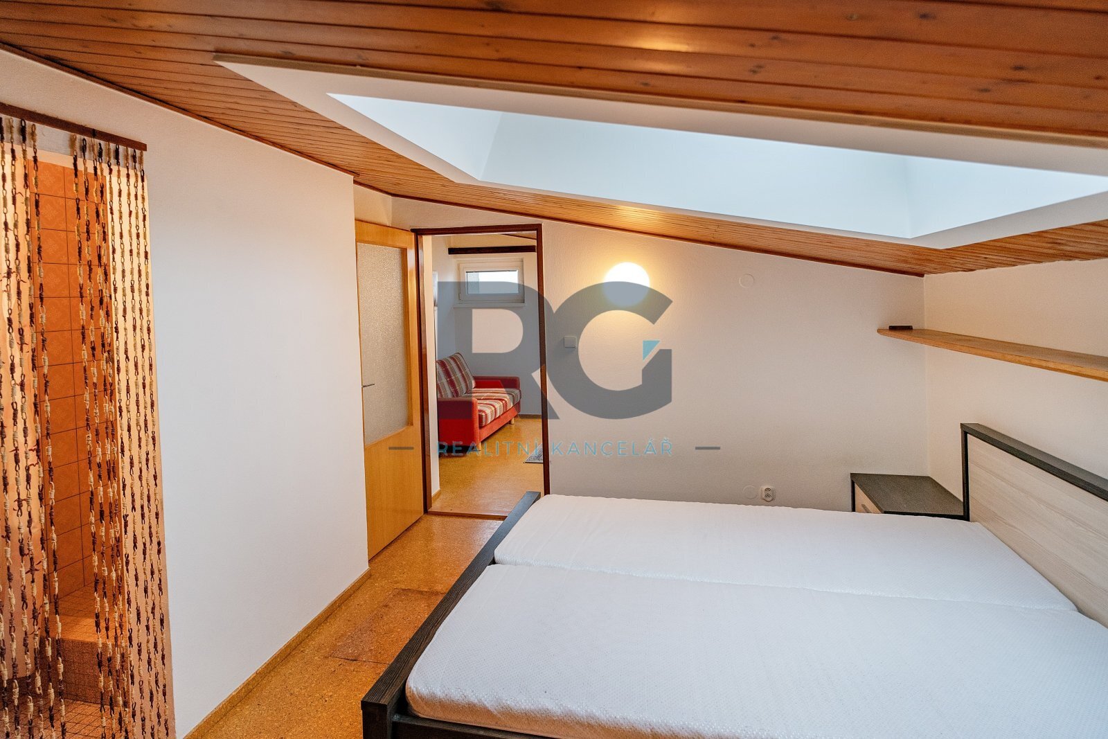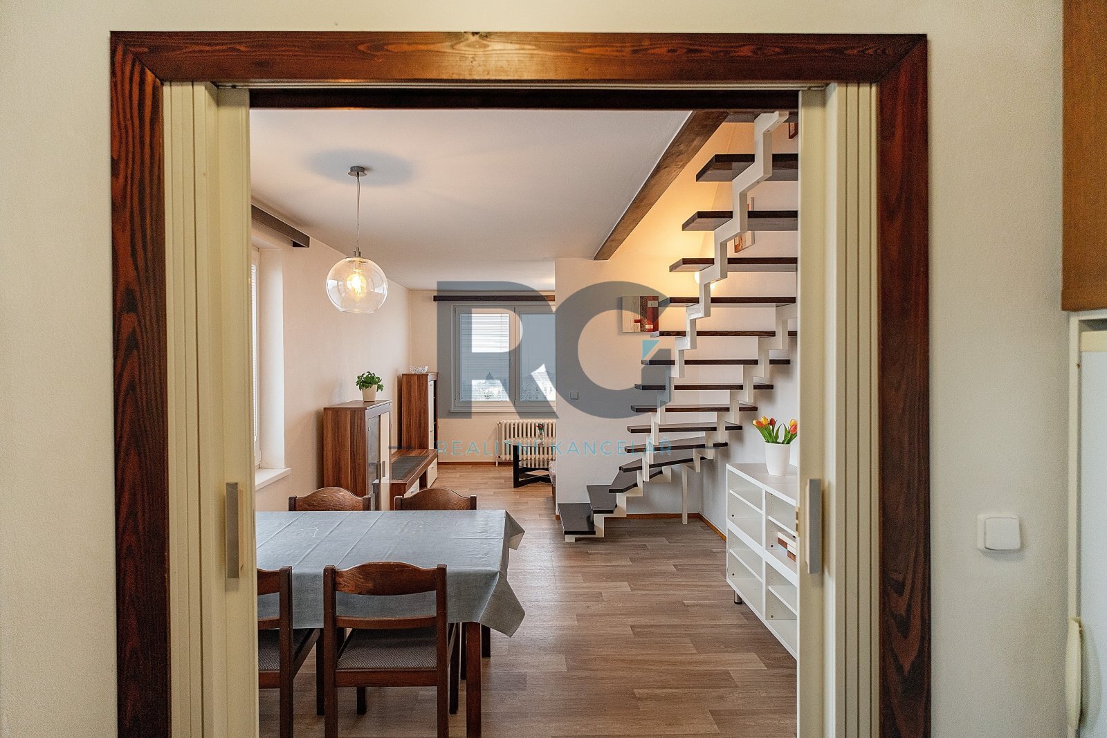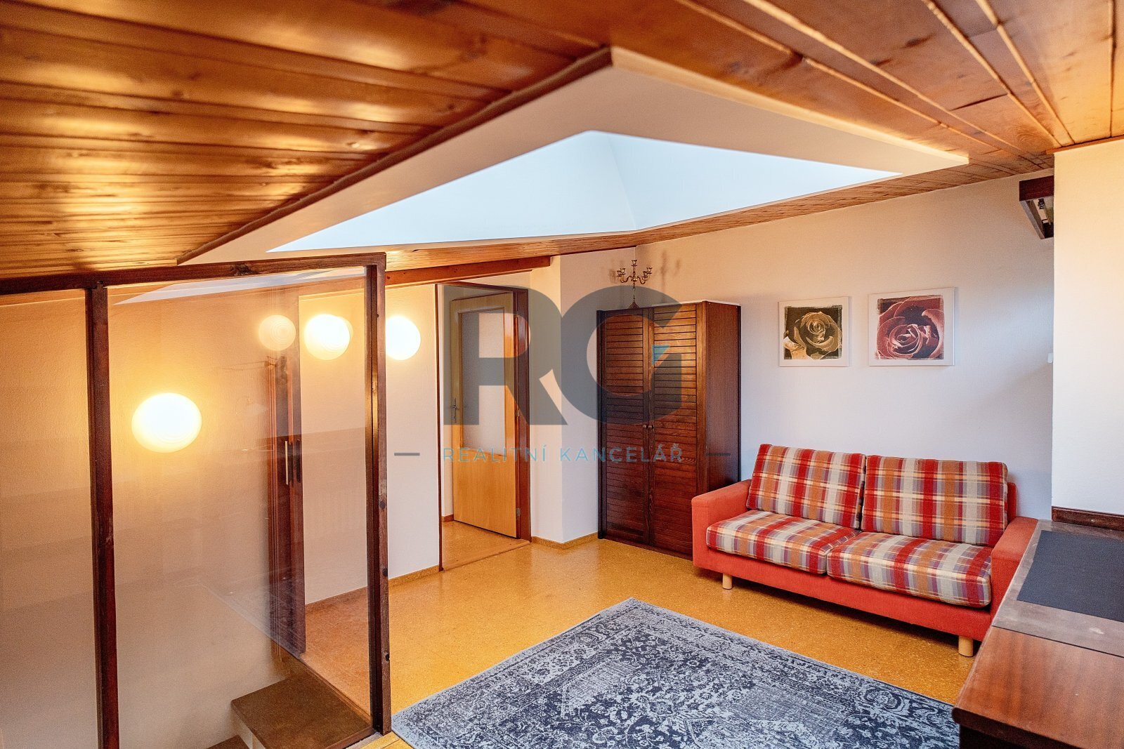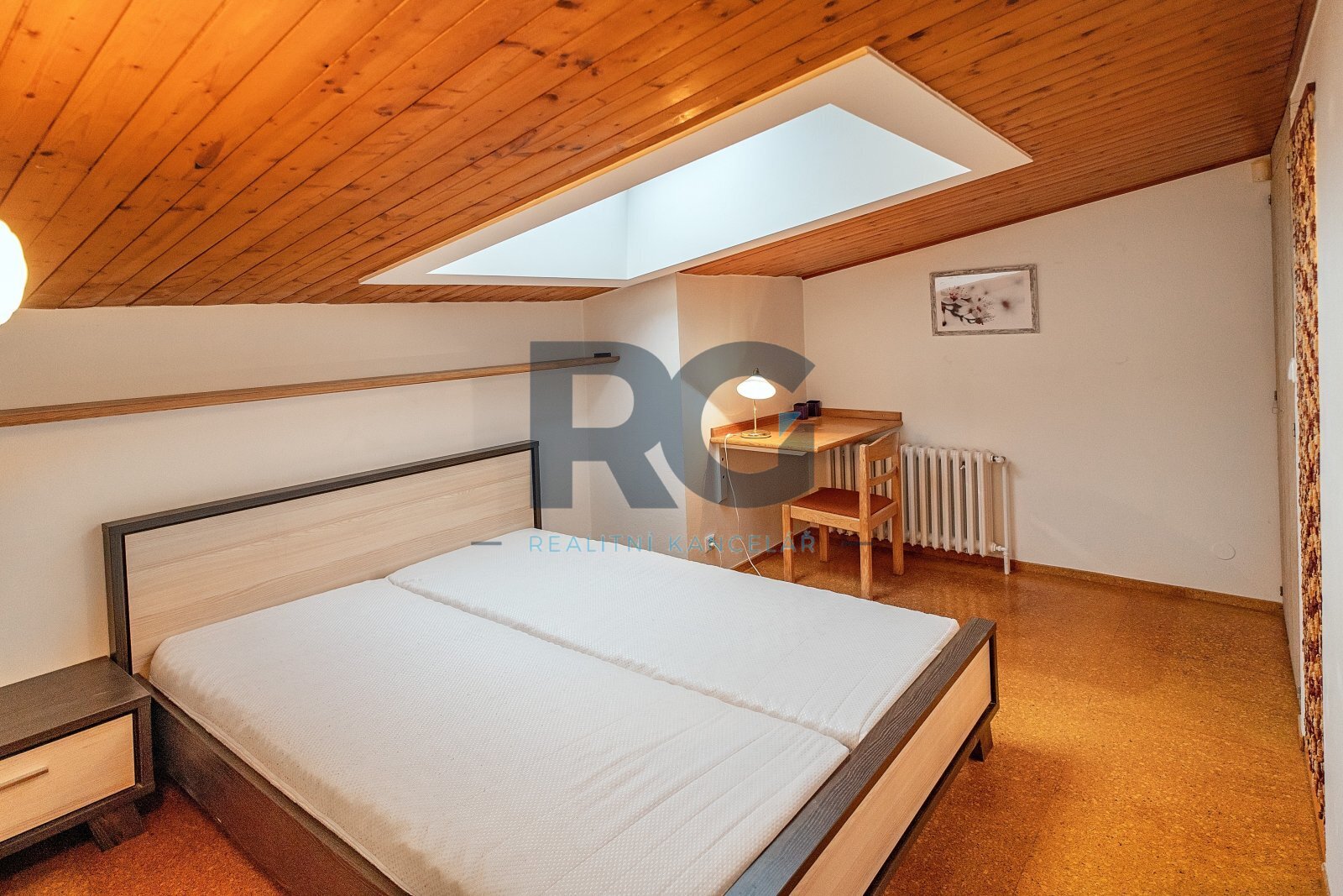 V přízemí bytu se nachází obývací pokoj s jídelnou, kuchyně, ložnice se vstupem na balkon a dětský pokoj. Každý pokoj má samostatný vstup z chodby, žádný pokoj není průchozí. Dále je zde k dispozici technická místnost, ve které je umístěn plynový kotel a je zde místo pro pračku, koupelna s vanou a samostatná toaleta. Podkroví bytu nabízí pracovnu a jeden pokoj s vlastní koupelnou, ve které je sprchový kout. Byt je vybaven kuchyňskou linkou včetně spotřebičů (elektrická trouba, varná deska, mikrovlnná trouba, digestoř, myčka nádobí, lednice s mrazákem). Veškeré vybavení bytu je možné ponechat. Vytápění a ohřev vody je zajištěn vlastním plynovým kondenzačním kotlem.