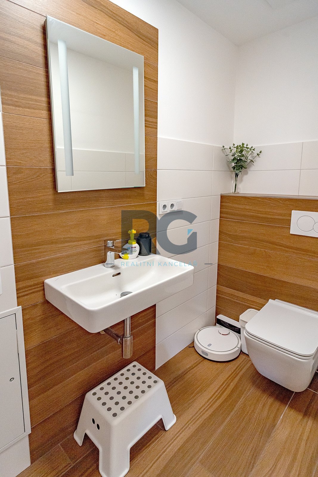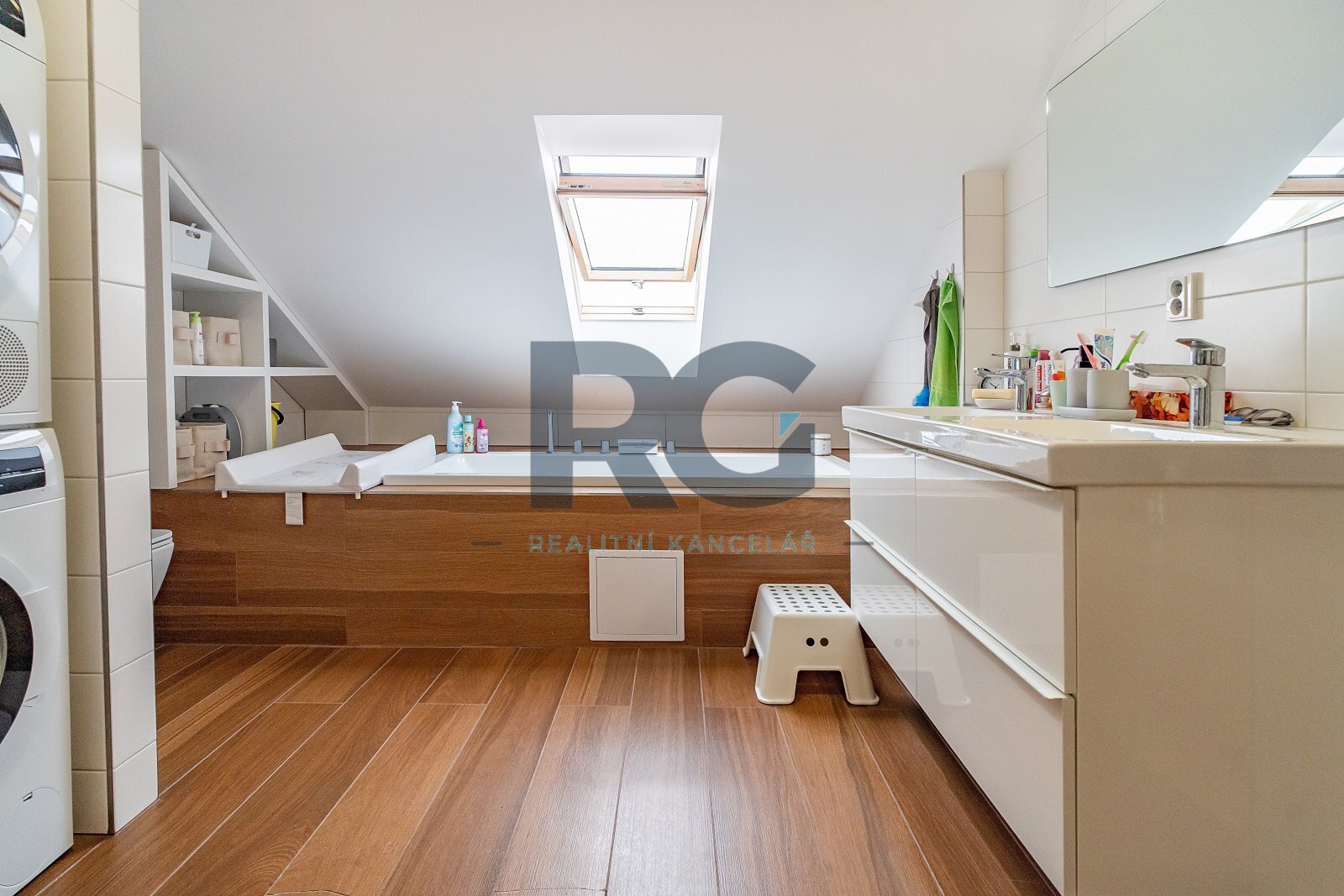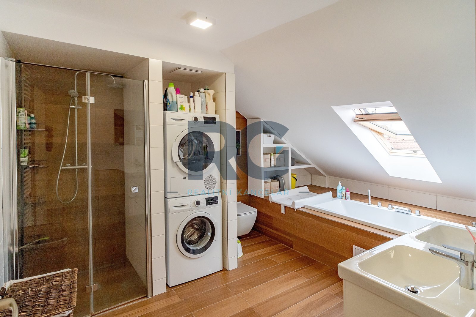 Koupelna je spojená s toaletou a je zde umístěný sprchový kout, vana, dvě umyvadla. Zázemí pro pračku a sušičku je taktéž v koupelně. V bytě se nachází dva úložné prostory o výměře 0,98m2 a 1,64 m2.