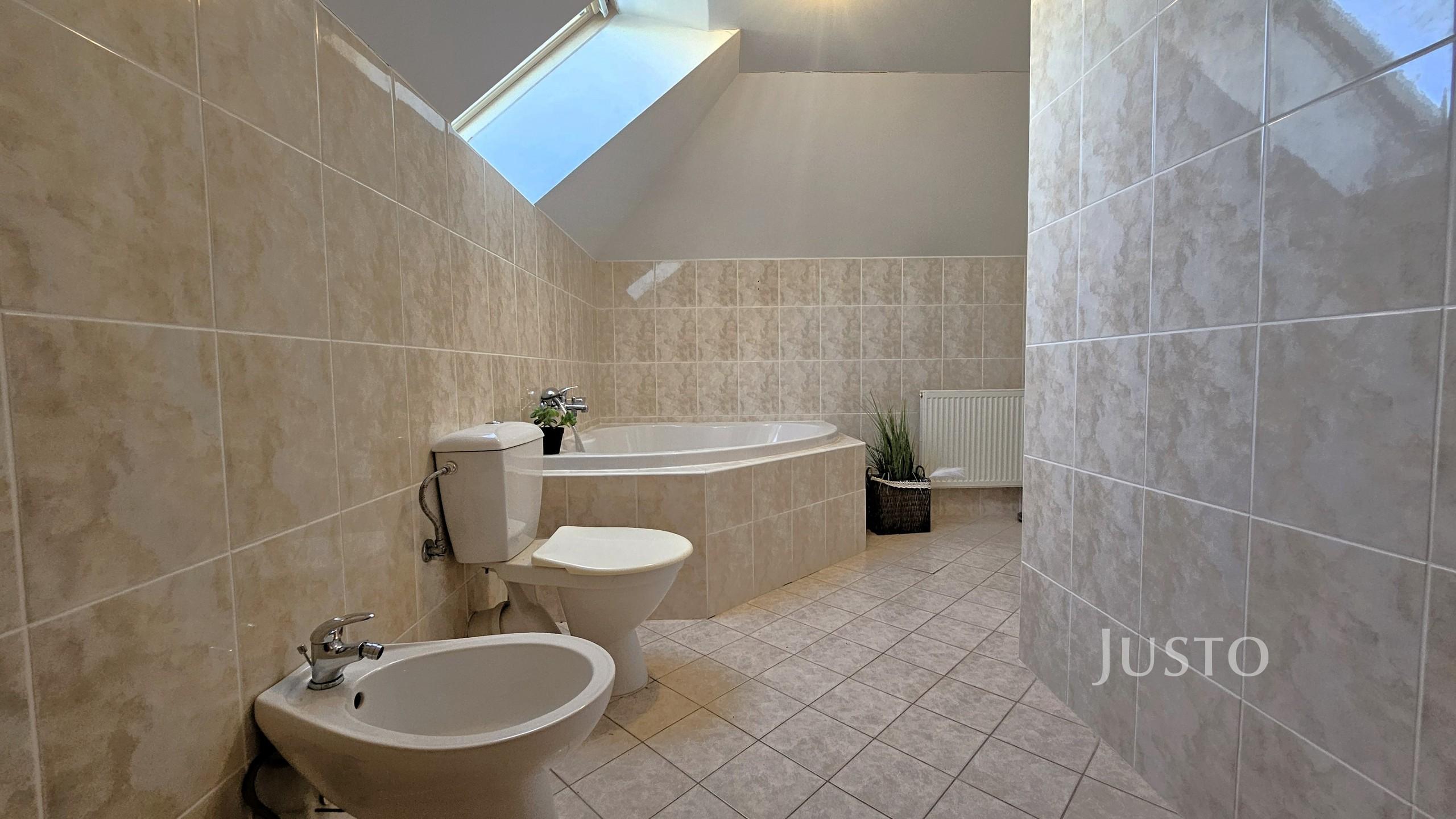 V podkroví Vás potěší šatna o výměře 2,8 m². Dále jsou zde dvě prostorné ložnice 14,8 m² a 17,6 m². Koupelna je s toaletou, bidetem, rohovou vanou, přímo odvětrána oknem. Ložnice v podkroví jsou plnohodnotné a bez výrazně snížených šikmých stropů, takže působí vzdušně, prostorně a nabízejí plnohodnotné využití každého metru čtverečního.