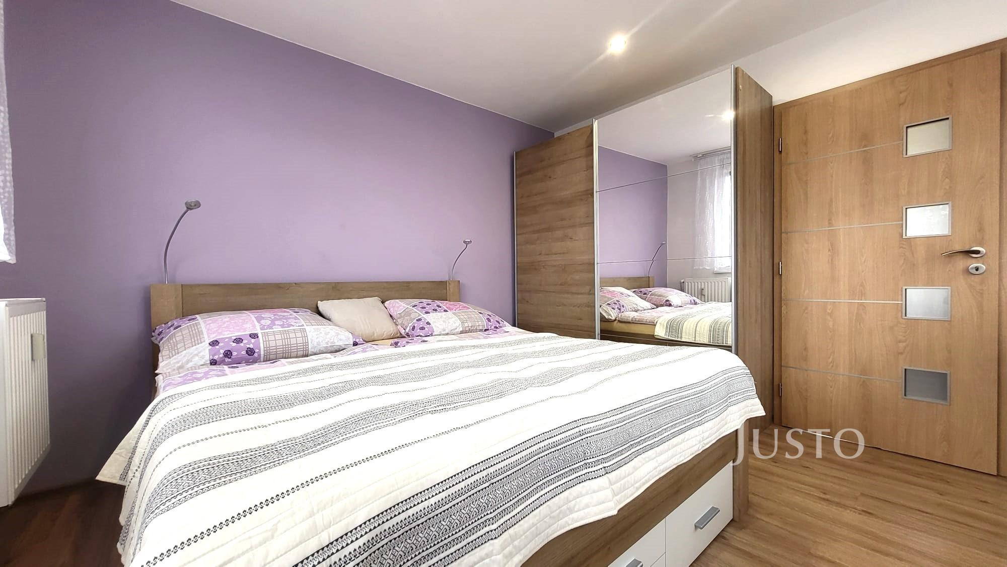 Ložnice s balkonem je vybavena manželským dvojlůžkem, šatní skříní a komodami pro uložení všeho potřebného. V letních měsících Vás jistě potěší klimatizace, která je umístěna v ložnici. Pohodlně však upraví teplotu v obou obytných místnostech.