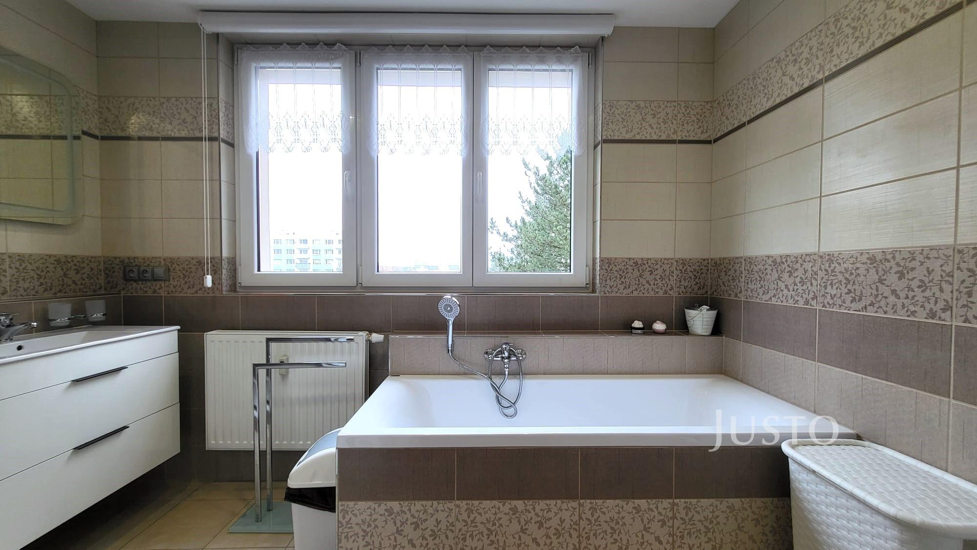 Prostorná koupelna s velkým oknem je se sprchovým koutem, vanou, pračkou a sušičkou. Toaleta je zvlášť.