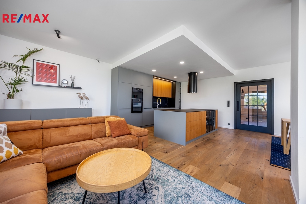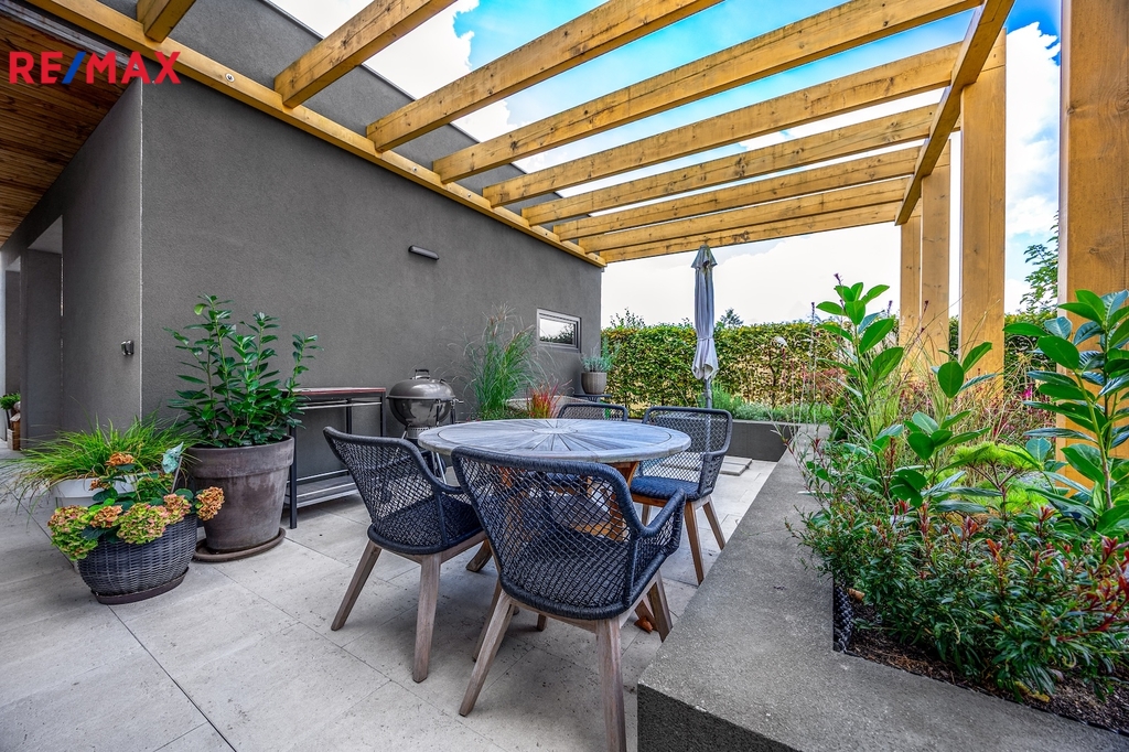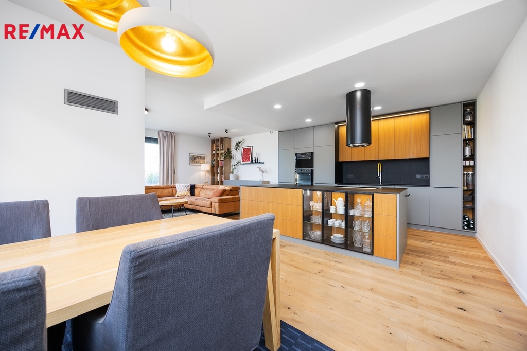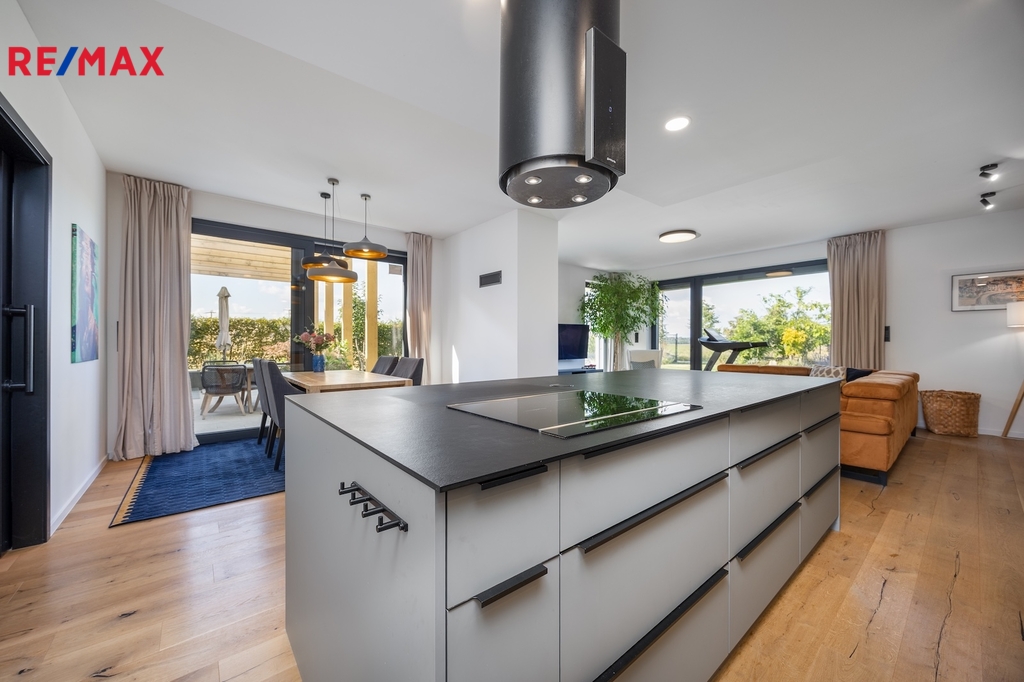 Kuchyňská linka je vybavena špičkovými vestavěnými spotřebiči De Dietrich, na podlahách byly použitý kvalitní třívrstvé dubové lamely nebo italské keramické dlažby. Velkoformátová okna s izolačním trojsklem propojují tuto část domu s venkovní terasou a navazující zahradou, která byla navržena zahradním architektem.