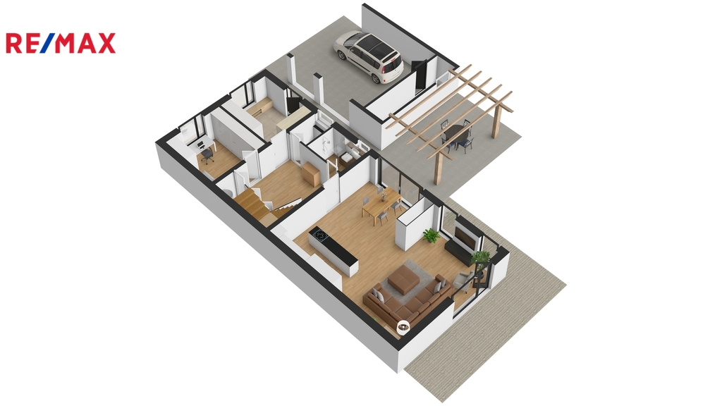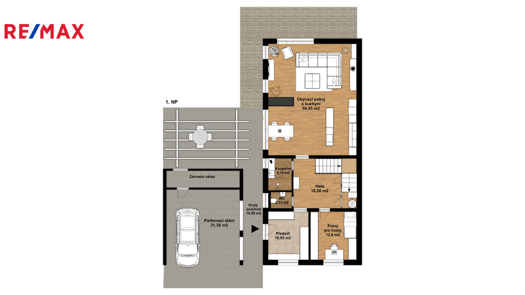 V 1. NP je k dispozici zádveří, vstupní hala, obývací pokoj s kuchyní a jídelním koutem, pokoj pro hosty, koupelna se sprchovým koutem a samostatná toaleta.
